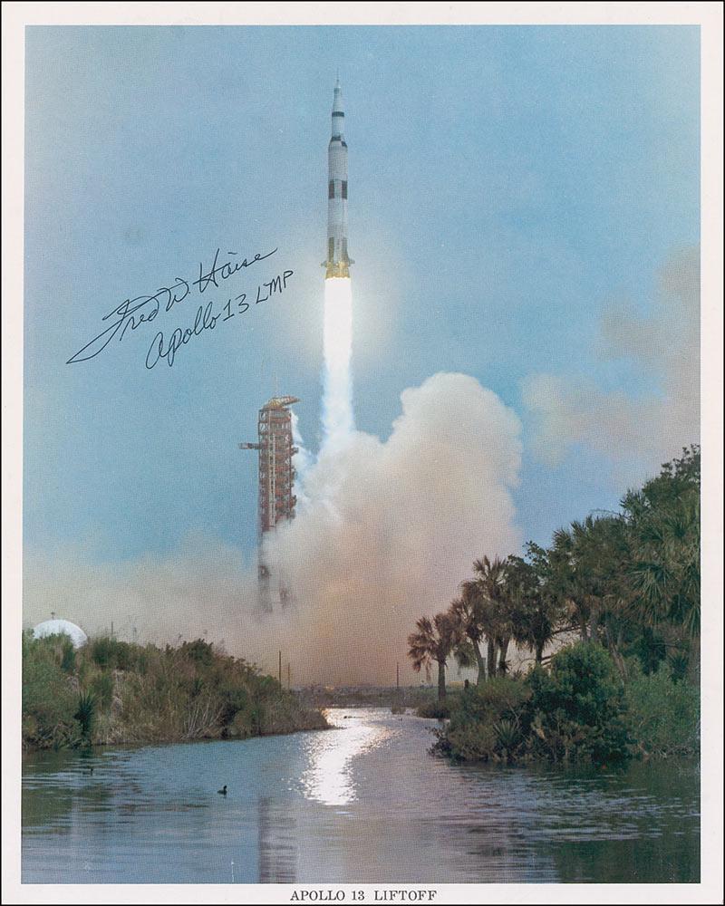 Color 8 x 10 NASA photo of the Apollo 13 liftoff, signed in black ballpoint “Fred W. Haise, Apollo 13 LMP.” In fine condition.