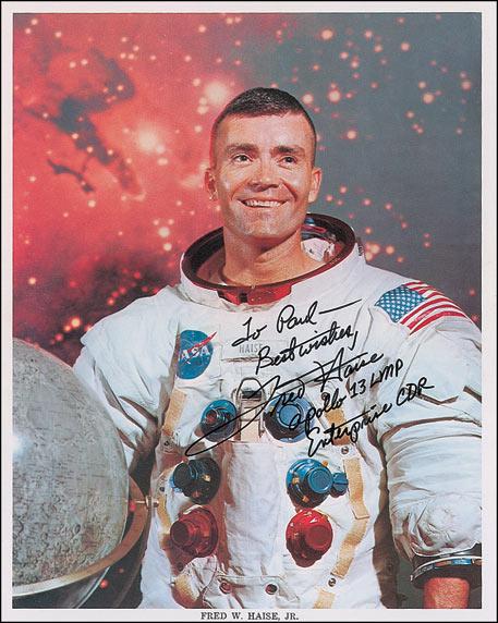 Color 8 x 10 NASA photo of Haise in his spacesuit standing next to a lunar globe, signed and inscribed in black felt tip, “To Paul-Best Wishes, Fred Haise, Apollo 13 LMP, Enterprise CDR.” In fine condition, with light contrast to Haise’s signature.