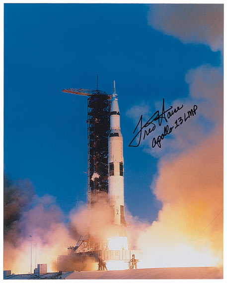 Color glossy 8 x 10 photo of a rocket during lift-off, signed in black felt tip, “Fred Haise, Apollo 13 LMP.” In fine condition.