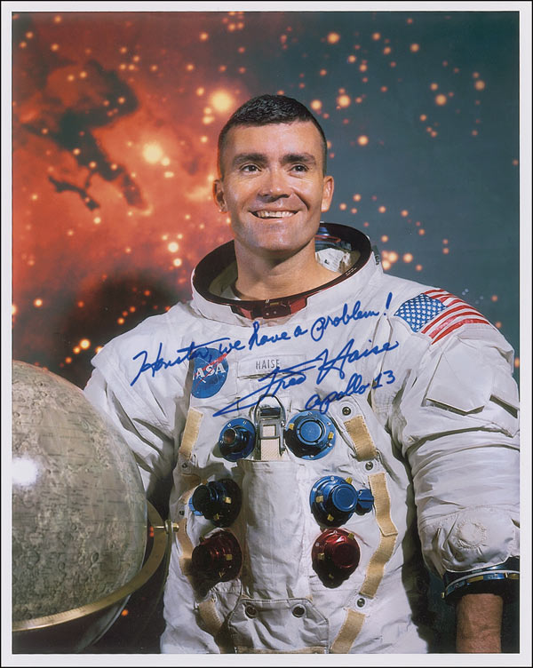 Color satin-finish 8 x 10 photo of Haise posing in his white spacesuit against a celestial background, signed in blue felt tip, “Houston, we have a problem! Fred Haise, Apollo 13.” In very fine condition.