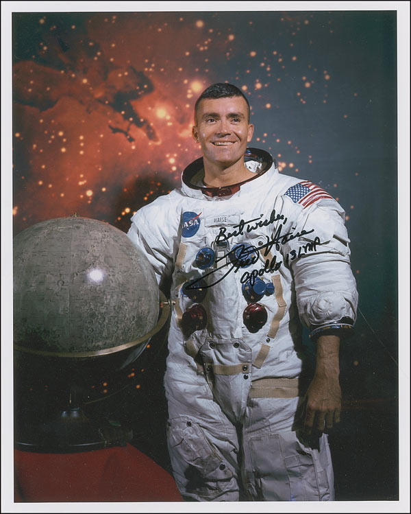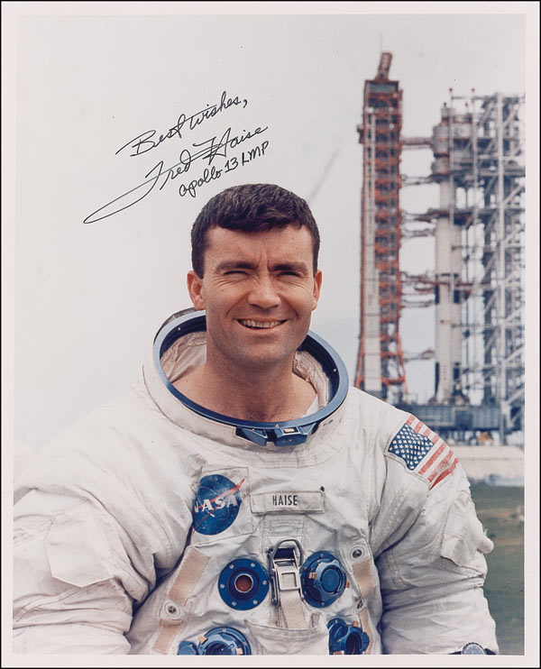 Two color satin-finish 8 x 10 photos of Haise in his spacesuit prior to the Apollo 13 mission, each signed in black felt tip, “Best wishes, Fred Haise, Apollo 13 LMP.” In very fine condition.