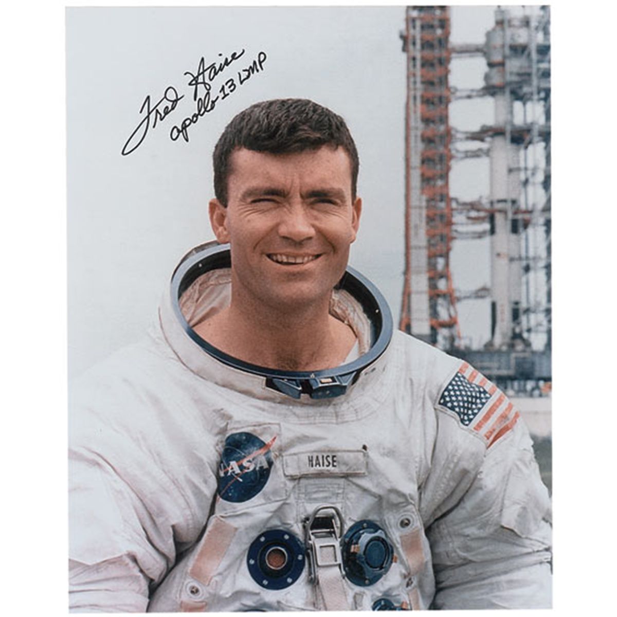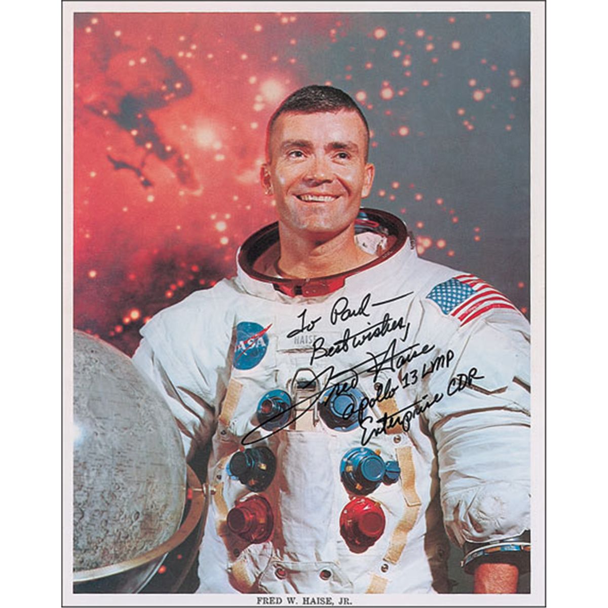 Three signed photos: color satin-finish 8 x 10 photo of Haise posing outside in his spacesuit in front of a launch pad, signed in black felt tip, “Fred Haise, Apollo 13 LMP;” color 10 x 8 NASA photo of the Apollo 13 prime crew posing together in jackets and ties, signed in black ballpoint; and a color 8 x 10 NASA photo of Haise in his spacesuit standing next to a lunar globe, signed and inscribed in black felt tip, “To Paul-Best Wishes, Fred Haise, Apollo 13 LMP, Enterprise CDR.” In overall fine condition, with light contrast to Haise’s signature on the NASA photo and scattered surface impressions and dings to the crew photo.