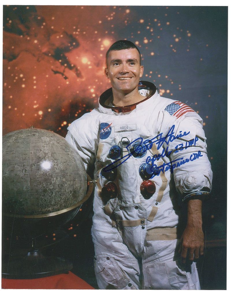 Color satin-finish 8 x 10 photo of Haise posing in his white spacesuit against a celestial background, signed in blue felt tip, “Fred Haise, Apollo 13 LMP, Enterprise CDR.” In fine condition, with a few trivial creases, and some light contrast to the signature and inscription.