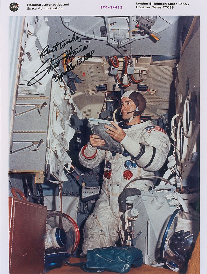 Color satin-finish 8 x 10 NASA ‘red-numbered’ photo of Haise during training, signed in black felt tip, “Best wishes, Fred Haise, Apollo 13 LMP.” In fine condition.