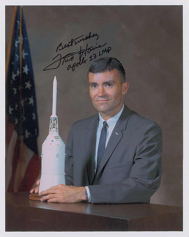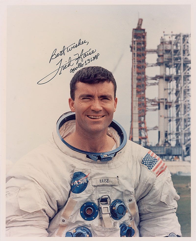 Two color satin-finish 8 x 10 photos of Haise, each signed in black felt tip, “Best wishes, Fred Haise, Apollo 13 LMP.” In overall fine condition.