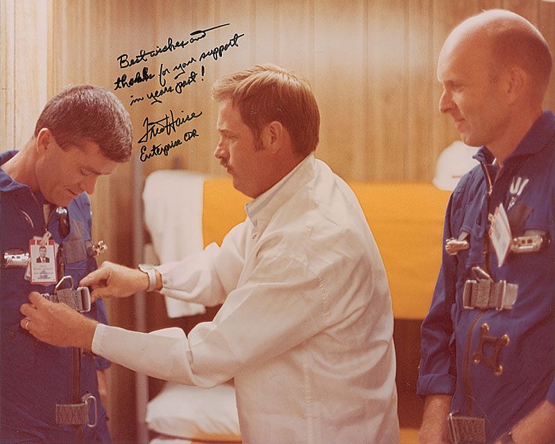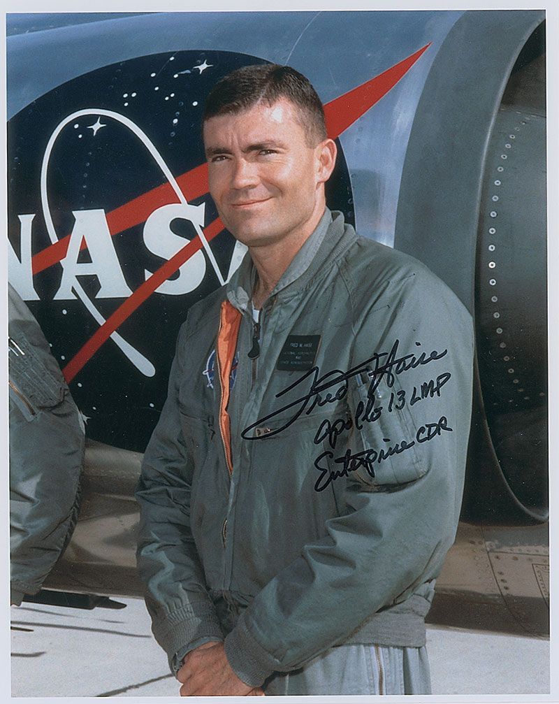 Two photos: color satin-finish 8 x 10 of Haise posing in front of a jet, signed in black felt tip, “Fred Haise, Apollo 13 LMP, Enterprise CDR”; and a color glossy 10 x 8 photo of Haise during shuttle training, signed in black felt tip, “Best wishes and thanks for your support in years past! Fred Haise, Enterprise CDR.” In fine condition.