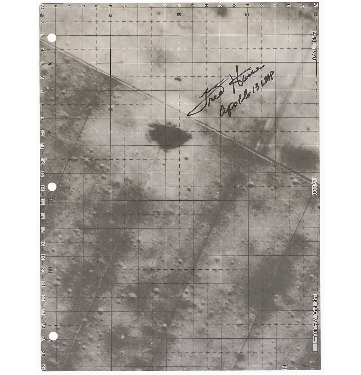 Original NASA lunar surface map removed from the ‘Lunar Surface Exploration Map Data Package’ manual, one page both sides, 8 x 10.5, signed in black felt tip, “Fred Haise, Apollo 13 LMP.” The page is dated April 1970 and map image identified as “LSE Fra Mauro—1.” In fine condition.