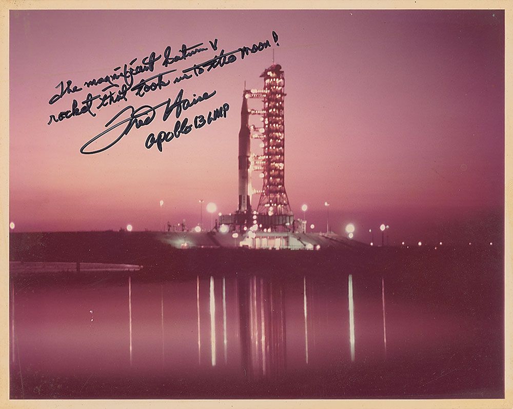 Color glossy 10 x 8 photo of the Kennedy Space Center launch pad, signed in black felt tip, “The magnificent Saturn V rocket that took us to the moon! Fred Haise, Apollo 13 LMP.” In fine condition, with some scattered unobtrusive surface marks.