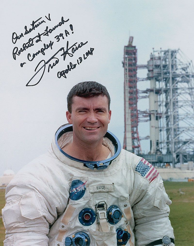 Color satin-finish 8 x 10 photo of Haise in his white space suit posing near the launch pad, signed in black felt tip, “Our Saturn V rocket at launch on Complex 39A! Fred Haise Apollo 13 LMP.” In very fine condition.
