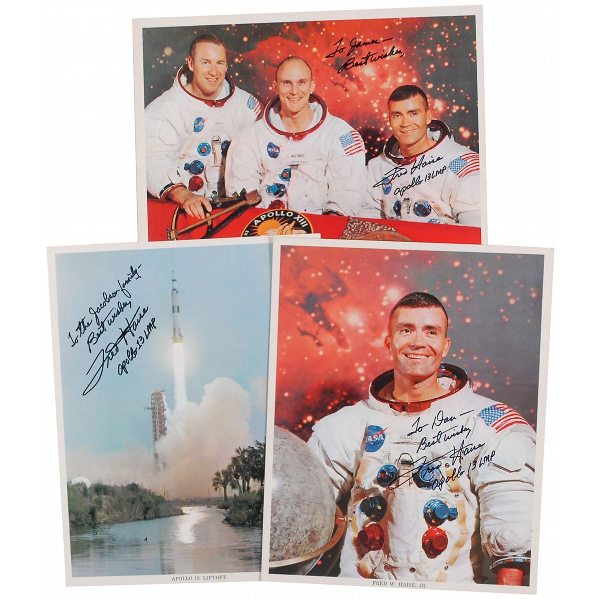 Three color NASA photos, two 8 x 10 and one 10 x 8, including a photo of the original Apollo 13 crew, each signed and inscribed in black felt tip by Haise. In fine condition.