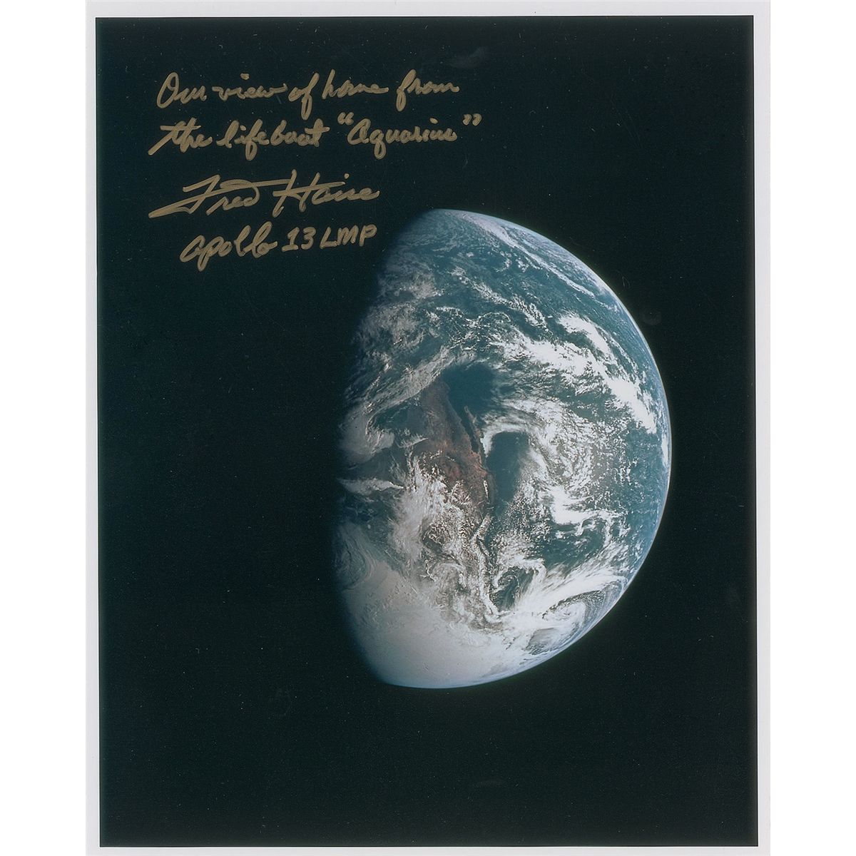 Remarkable color satin-finish 8 x 10 photo of Earth taken during the Apollo 13 mission, signed in gold ink, “Our view of home from the lifeboat ‘Aquarius,’ Fred Haise, Apollo 13 LMP.” In very fine condition.