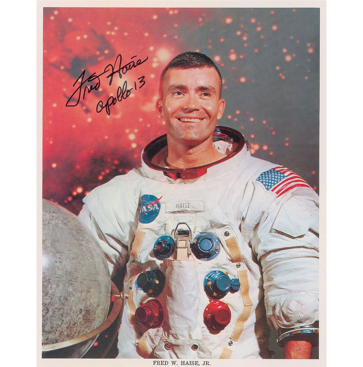 Collection of three satin-finish photos and one official NASA lithograph, 8 x 10 and 10 x 8, each signed in black felt tip or gold ink by Haise. In overall fine condition.