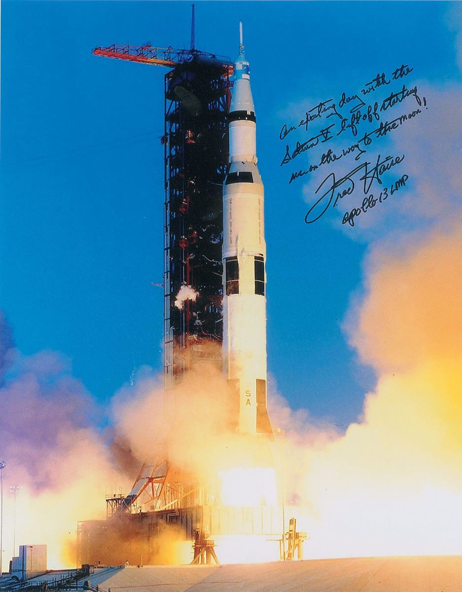 Vivid color satin-finish 11 x 14 photo of an Apollo 13 rocket launch, signed in black felt tip, “An exciting day with the Saturn V liftoff starting us on the way to the moon! Fred Haise, Apollo 13 LMP.” In fine condition.