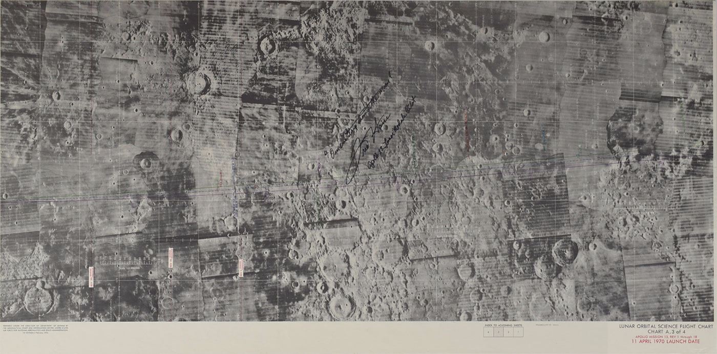 Official Apollo 13 Lunar Orbital Science Flight Chart, 43 x 21.5, signed in black felt tip, "'Our one trip around the moon!' Fred Haise, Apollo 13 Lunar Module Pilot." Labeled in the lower right corner, "Chart A, 3 of 4, Apollo Mission 13, REV 1 through 18, 11 April 1970, Launch Date," this chart displays the harsh lunar terrain and the planned tracking lines for several Apollo 13 lunar orbits. Ultimately Apollo 13 made only one lunar orbit, using the moon’s own gravity to sling the damaged spacecraft back to Earth. Rolled and in fine condition.