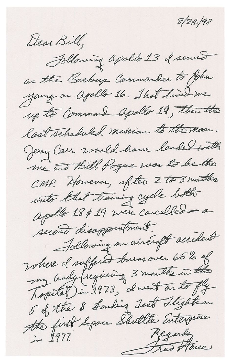ALS, one page, 5 x 8, August 24, 1998. Letter to Bill Van Laethem, in full: "Following Apollo 13 I served as the Backup Commander to John Young on Apollo 16. That lined me up to command Apollo 19, then the last scheduled mission to the moon. Jerry Carr would have landed with me and Bill Pogue was to be the CMP. However, after 2 to 3 months into that training cycle both Apollo 18 & 19 were cancelled—a second disappointment. Following an aircraft accident when I suffered burns over 65% of my body (requiring 3 months in the hospital) in 1973, I went on to fly 5 of the 8 Landing Test Flights on the first Space Shuttle Enterprise in 1977." In very fine condition. Accompanied by the original mailing envelope, addressed in Haise's hand.