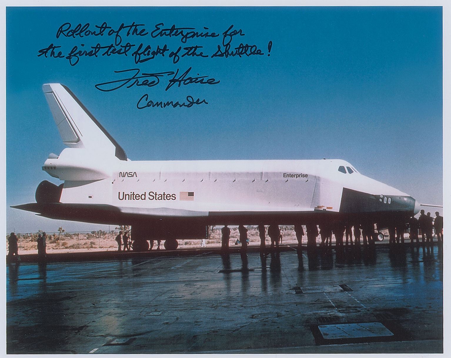 Color satin-finish 10 x 8 photo of the first Space Shuttle Orbiter, signed in black felt tip, "Rollout of the Enterprise for the first test flight of the Shuttle! Fred Haise, Commander." In very fine condition.