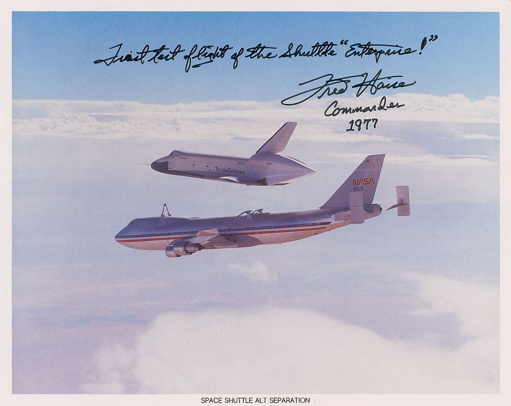 Official color 10 x 8 NASA lithograph of the Shuttle Orbiter 101 'Enterprise' moments after separating from the NASA 747 Shuttle Carrier Aircraft during a Shuttle Approach and Landing Test, signed in black felt tip, "First test flight of the Shuttle 'Enterprise!' Fred Haise, Commander, 1977." In very fine condition.