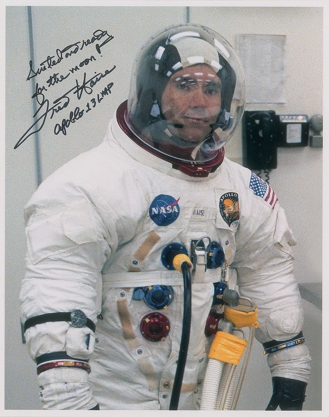 Color satin-finish 8 x 10 photo of Haise in his Apollo space suit, signed in black felt tip, "Suited and ready for the moon! Fred Haise, Apollo 13 LMP." In very fine condition.