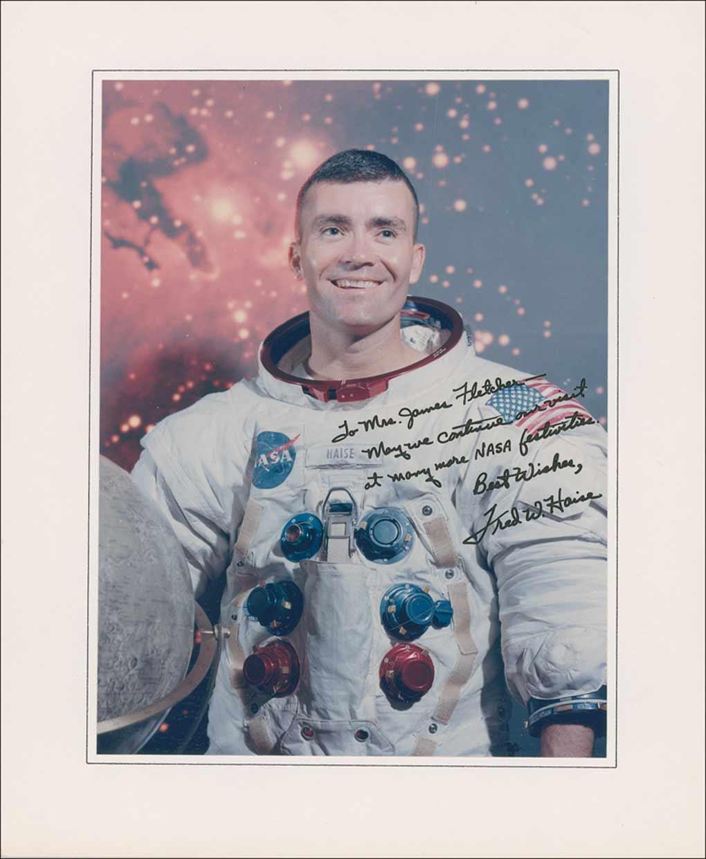 Color glossy 7 x 9.5 photo, affixed to a 10 x 12 mount, signed and inscribed in black ink to the wife of NASA administrator James Fletcher, “To Mrs. James Fletcher—May we continue our visit at many more NASA festivities. Best wishes, Fred Haise.” In fine condition.