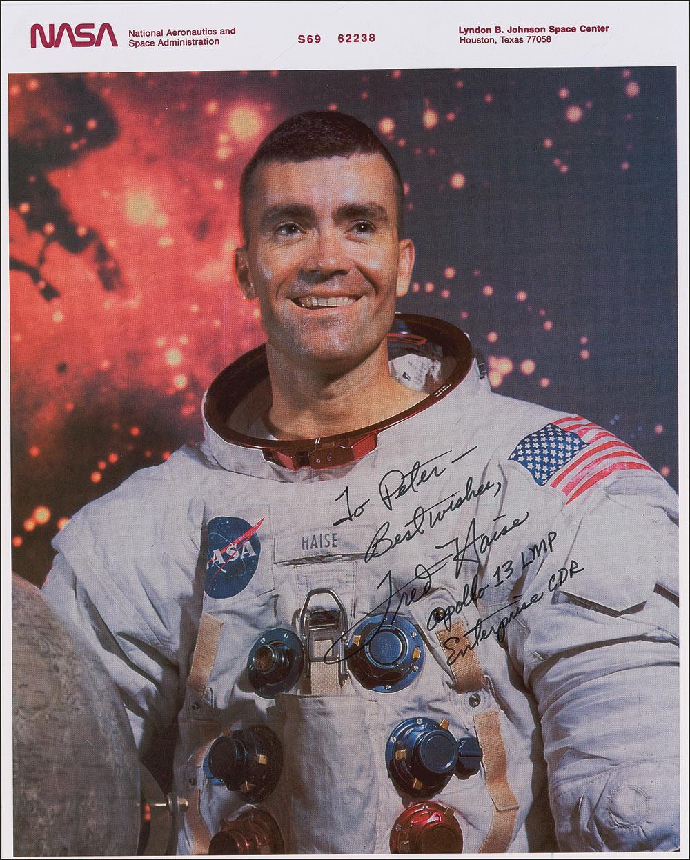 Color 8 x 10 “red-numbered” NASA photo of Haise in his space suit, signed and inscribed in black ink, “To Peter—Best wishes, Fred Haise, Apollo 13 LMP, Enterprise CDR”; and a satin-finish 10 x 8 photo of the damaged Apollo 13 module, signed and inscribed in silver ink. In fine condition.