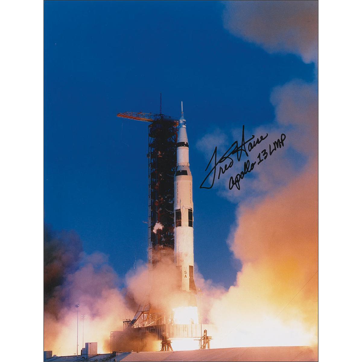 Color glossy 8 x 10 photo of a rocket during lift-off, signed in black felt tip, “Fred Haise, Apollo 13 LMP.” In fine condition.