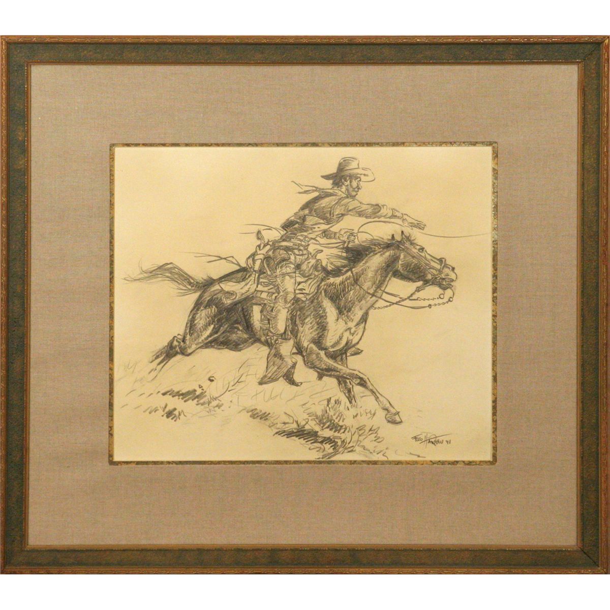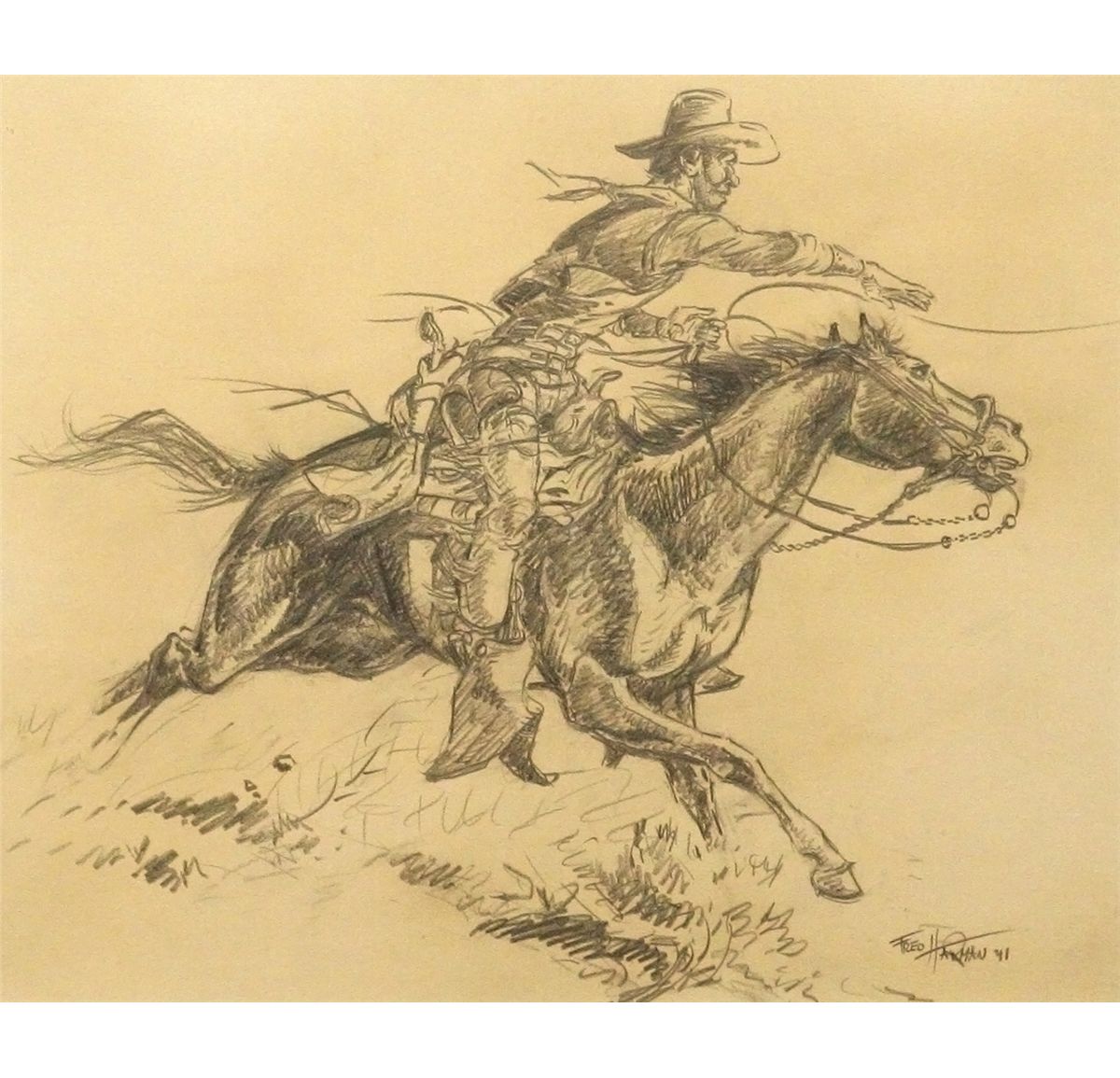 Fred Harman (1902 - 1982) CA. Ropin'. 16" x 20" charcoal. Signed lower right: FRED HARMAN 41.