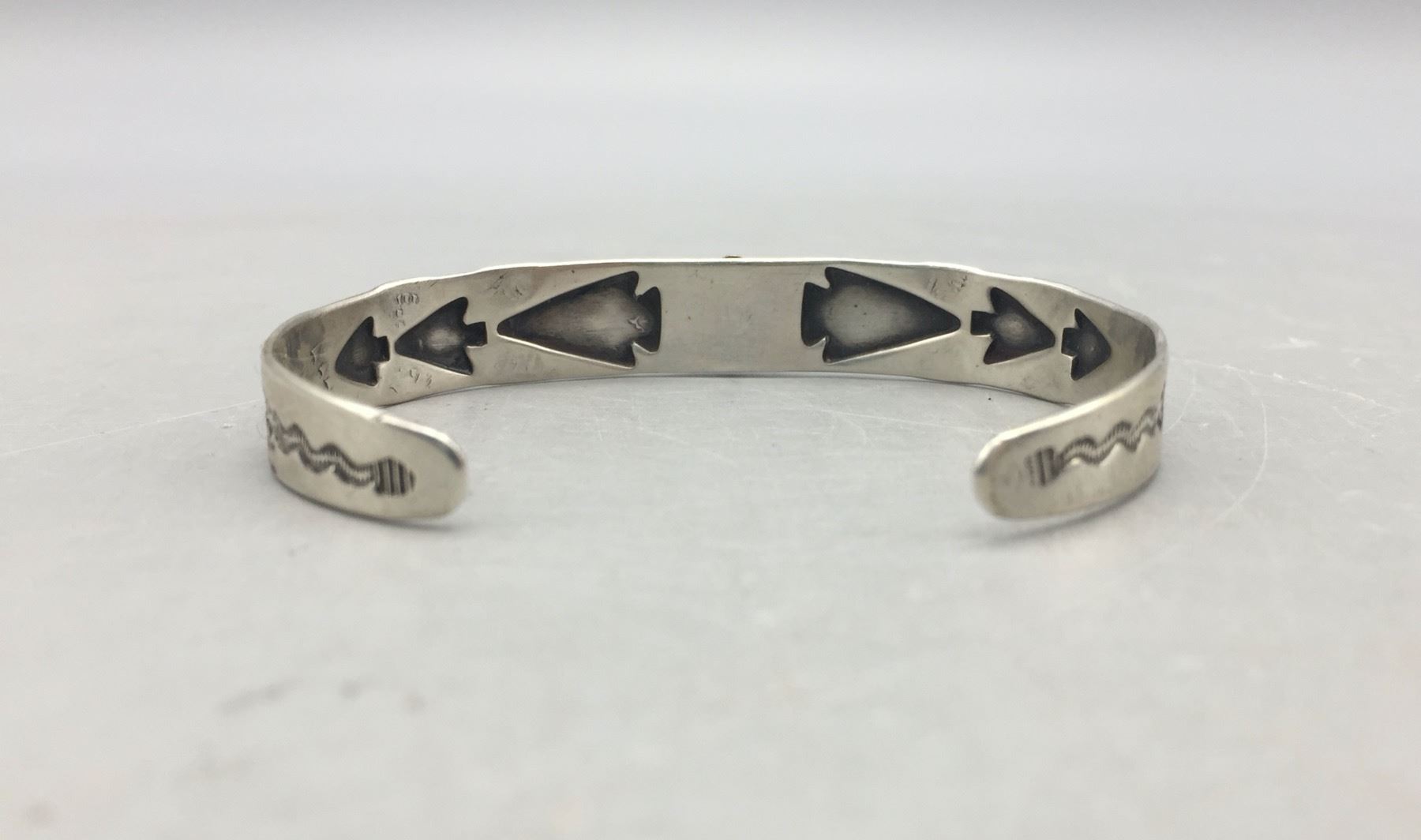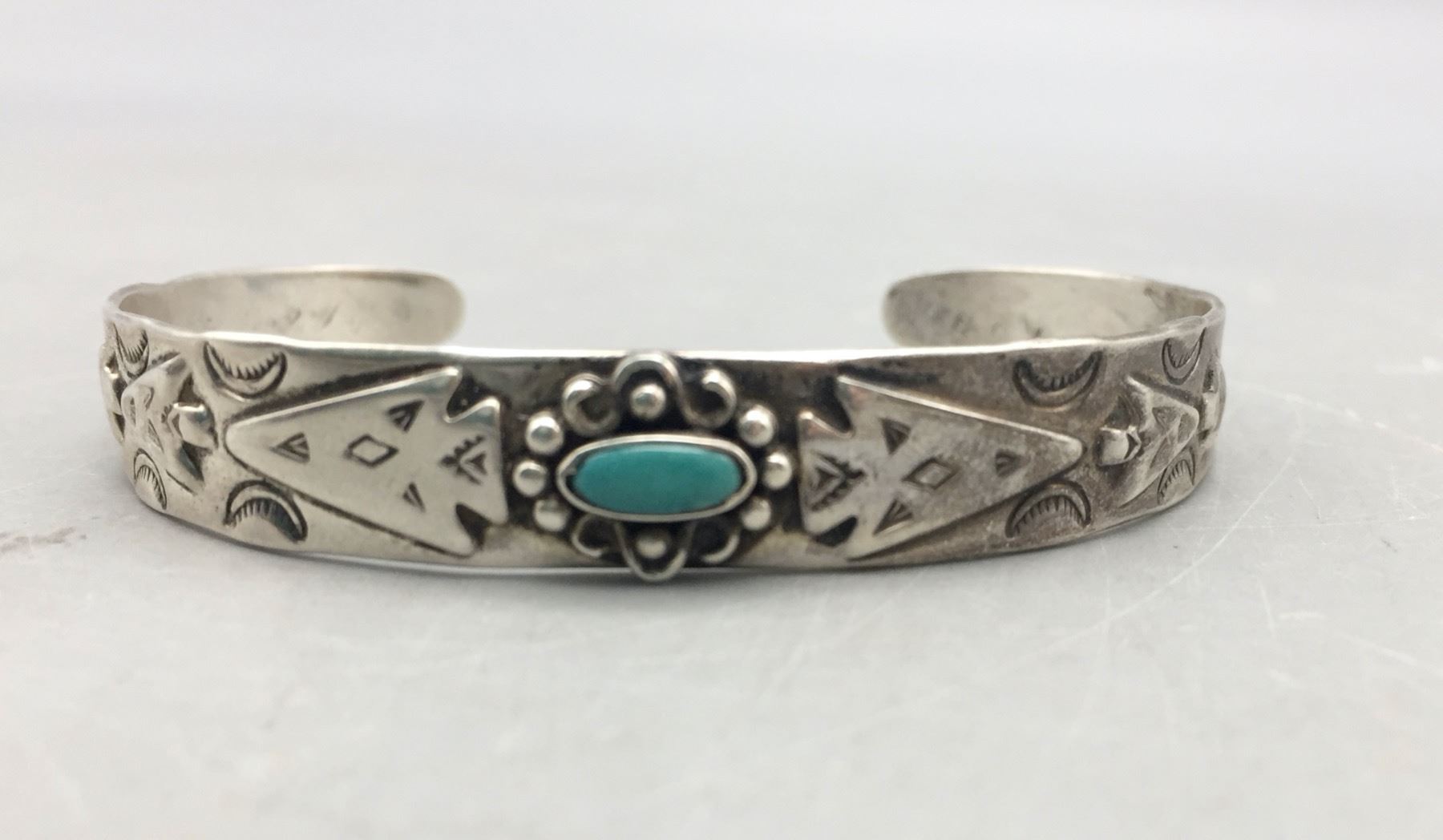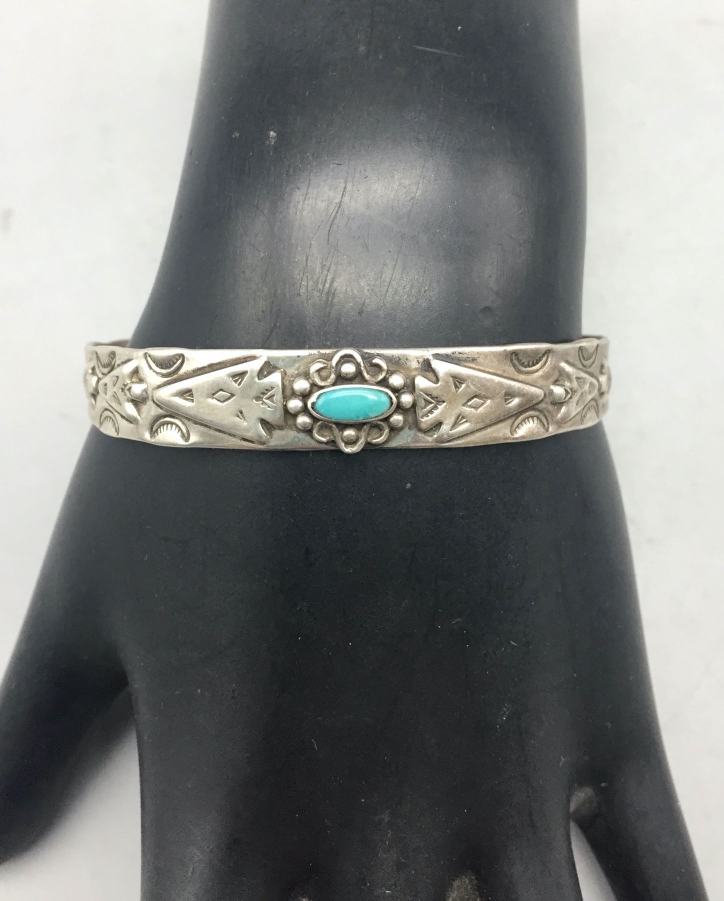 Description: For sale in this lot is a Fred Harvey Era turquoise bracelet featuring stamped arrowhead designs with a turquoise stone set in sterling silver. Maker: Unknown. Approx. Age: Vintage. Size: Inside circumference measures 5-1/4 inches. Opening is an additional 1-1/8 inches, fitting a 6-3/8 inch wrist. Width is 3/8 inches. Weighs 11.7 grams. Condition: Good for its age, normal wear expected. Please look closely at the pictures - they are an important part of our description. Shipping: There will be a $5 handling, packaging fee for shipping this lot. The actual cost of postage will be added on top of that.