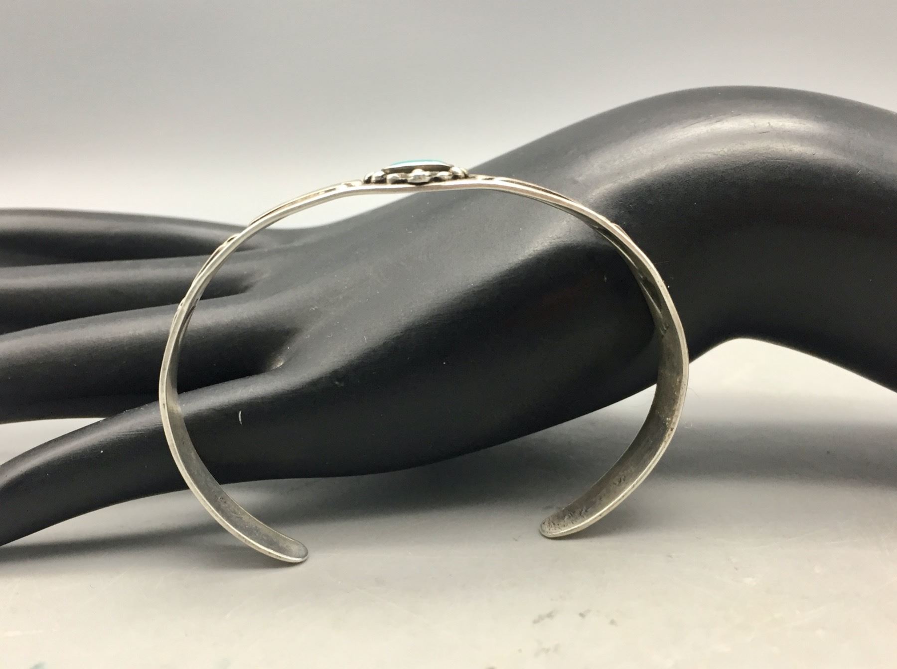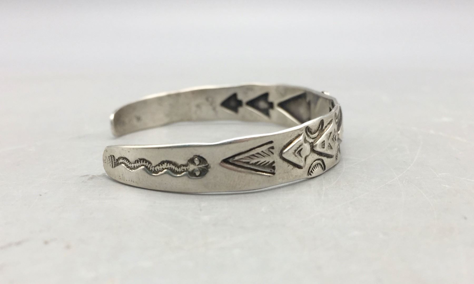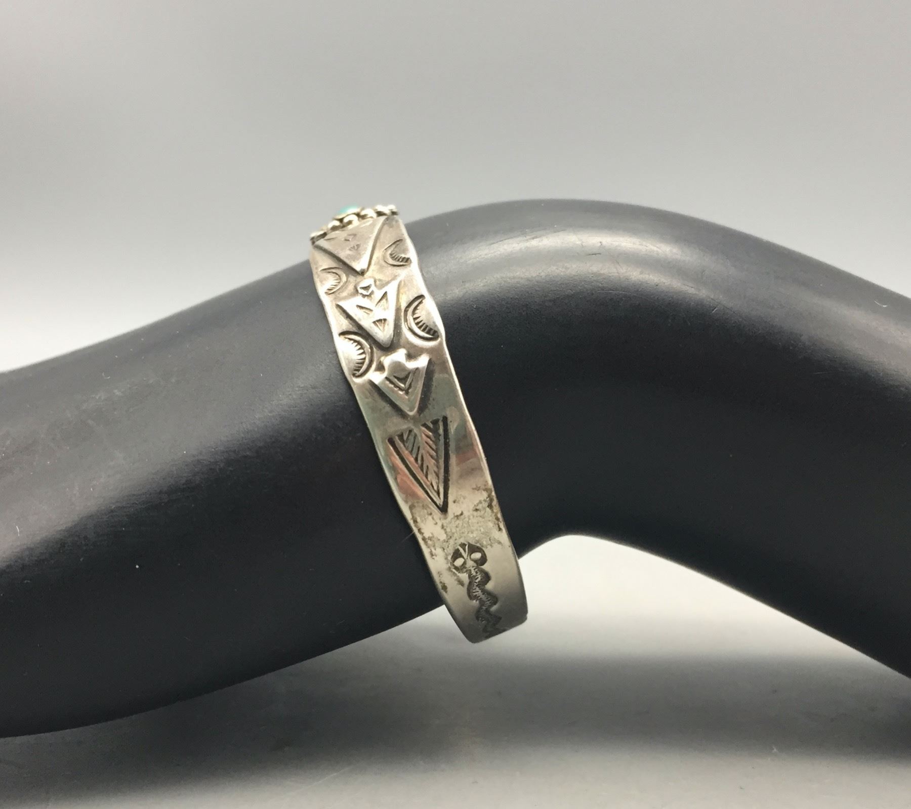 Description: For sale in this lot is a Fred Harvey Era turquoise bracelet featuring stamped arrowhead designs with a turquoise stone set in sterling silver. Maker: Unknown. Approx. Age: Vintage. Size: Inside circumference measures 5-1/4 inches. Opening is an additional 1-1/8 inches, fitting a 6-3/8 inch wrist. Width is 3/8 inches. Weighs 11.7 grams. Condition: Good for its age, normal wear expected. Please look closely at the pictures - they are an important part of our description. Shipping: There will be a $5 handling, packaging fee for shipping this lot. The actual cost of postage will be added on top of that.