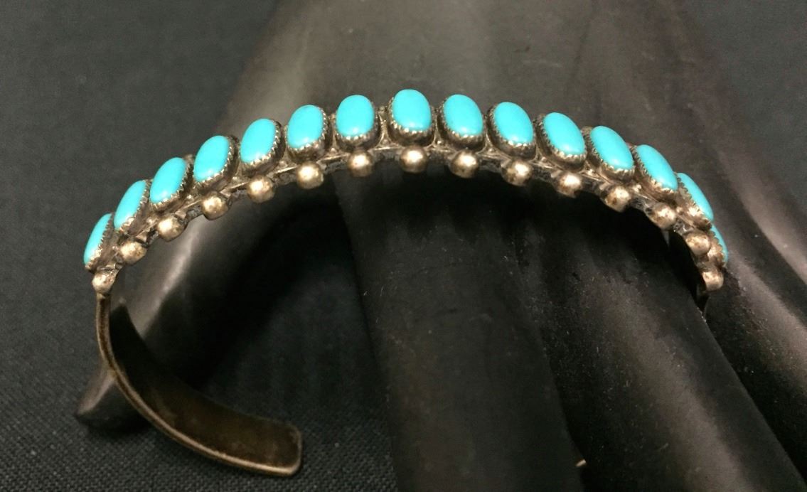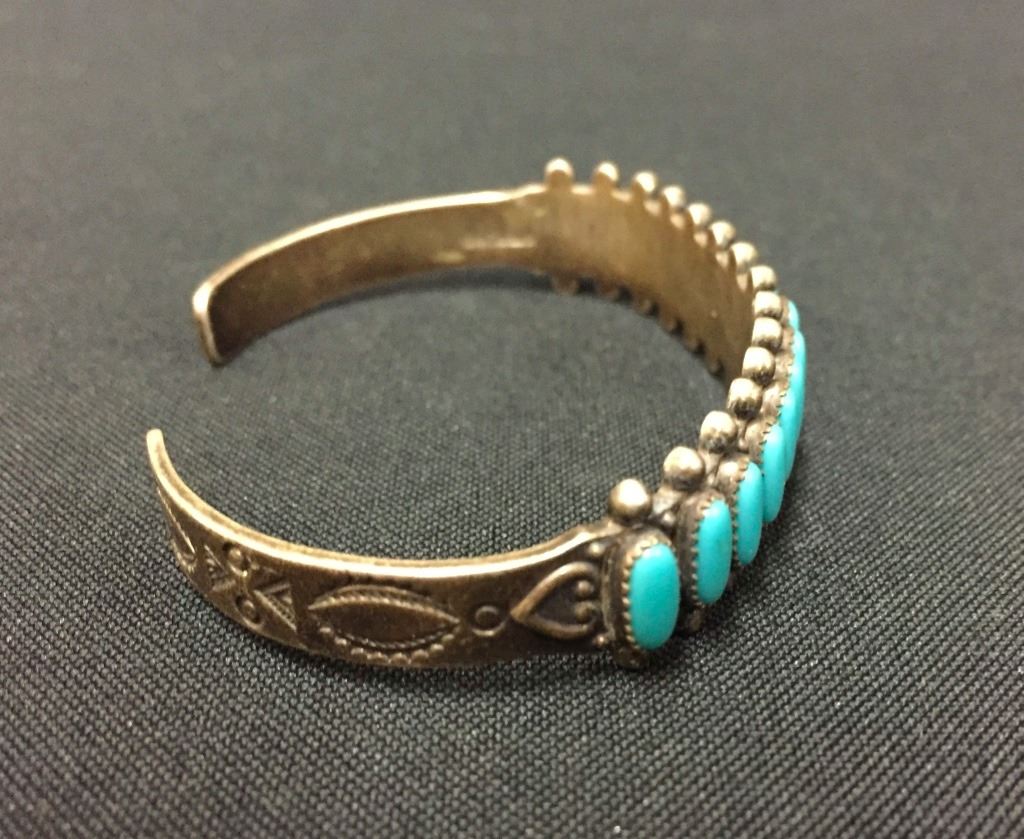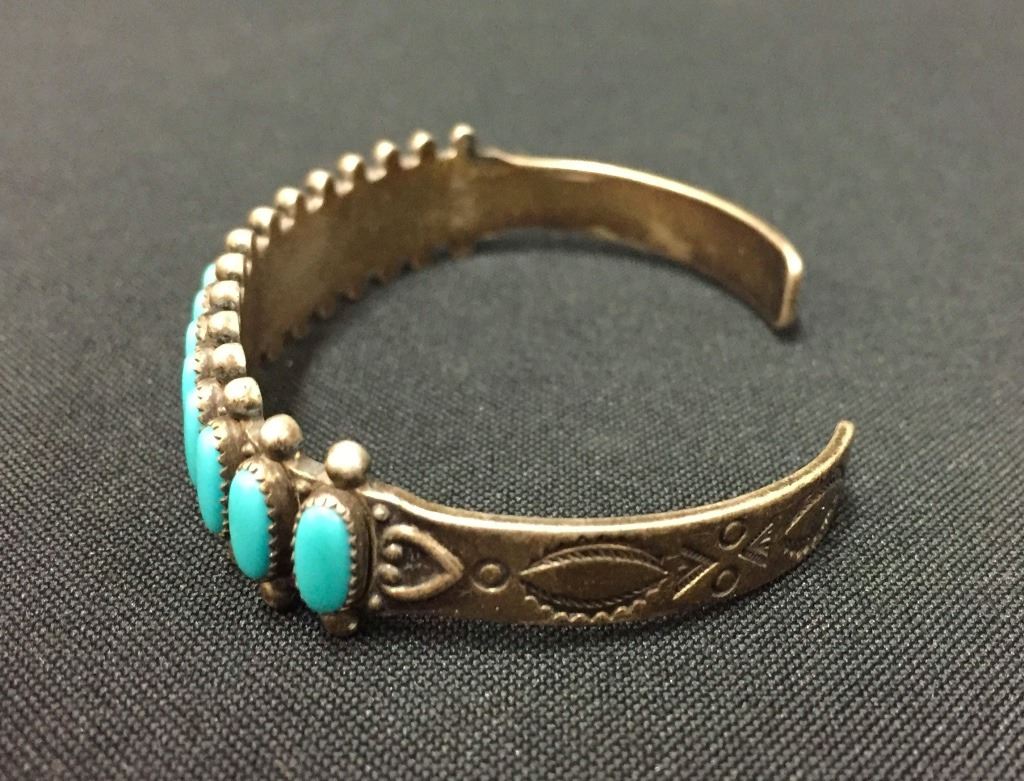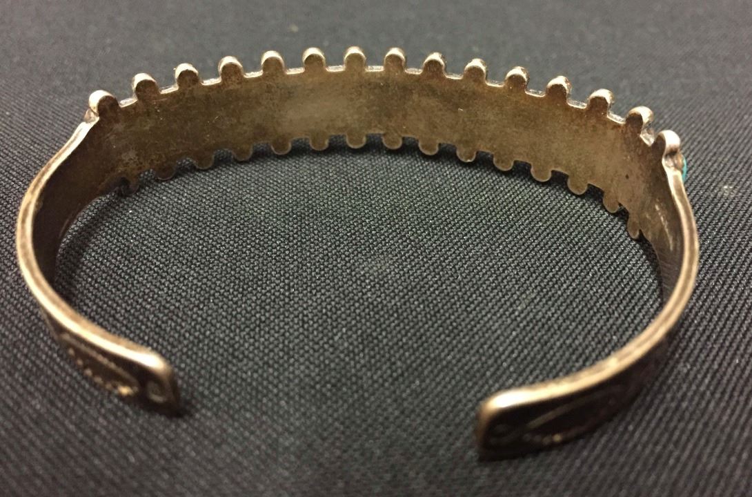 Maker: Unknown, but appears to be Navajo. Approx. Age: Circa 1940s. Size: Measures 5.25” inside plus there is just under a 1”opening. It’s .5” wide across the face and weighs 18.5g. Condition: Pretty good for its age. Additional Info: Old faux turquoise settings. Marked as sterling silver. Please look closely at the pictures - they are an important part of our description. Shipping: There will be a $5 handling / packaging fee for shipping this lot. The actual cost of postage will be added on top of that.