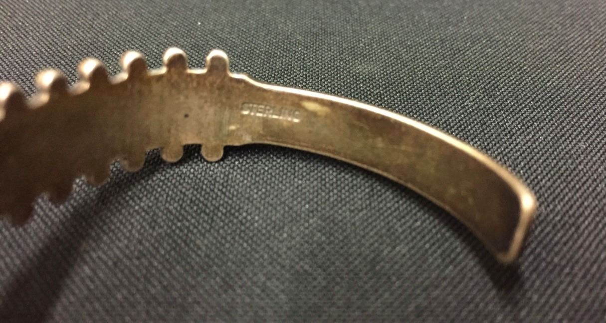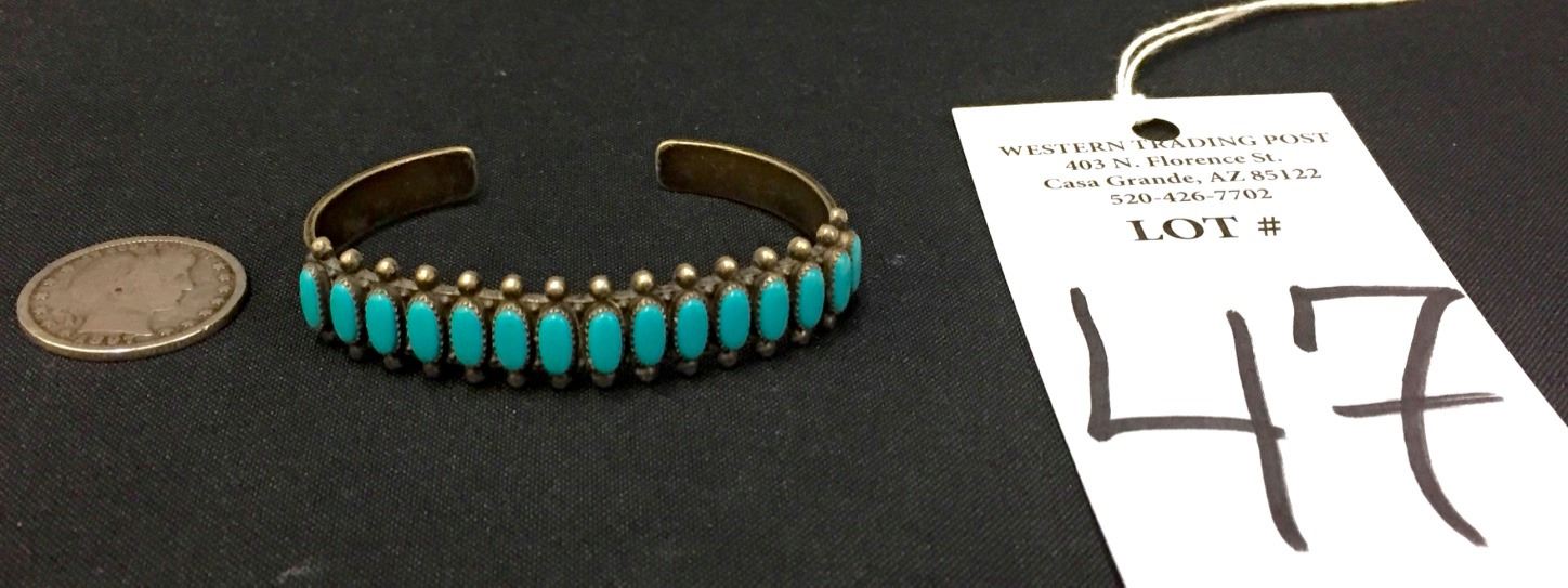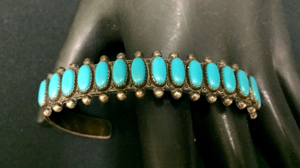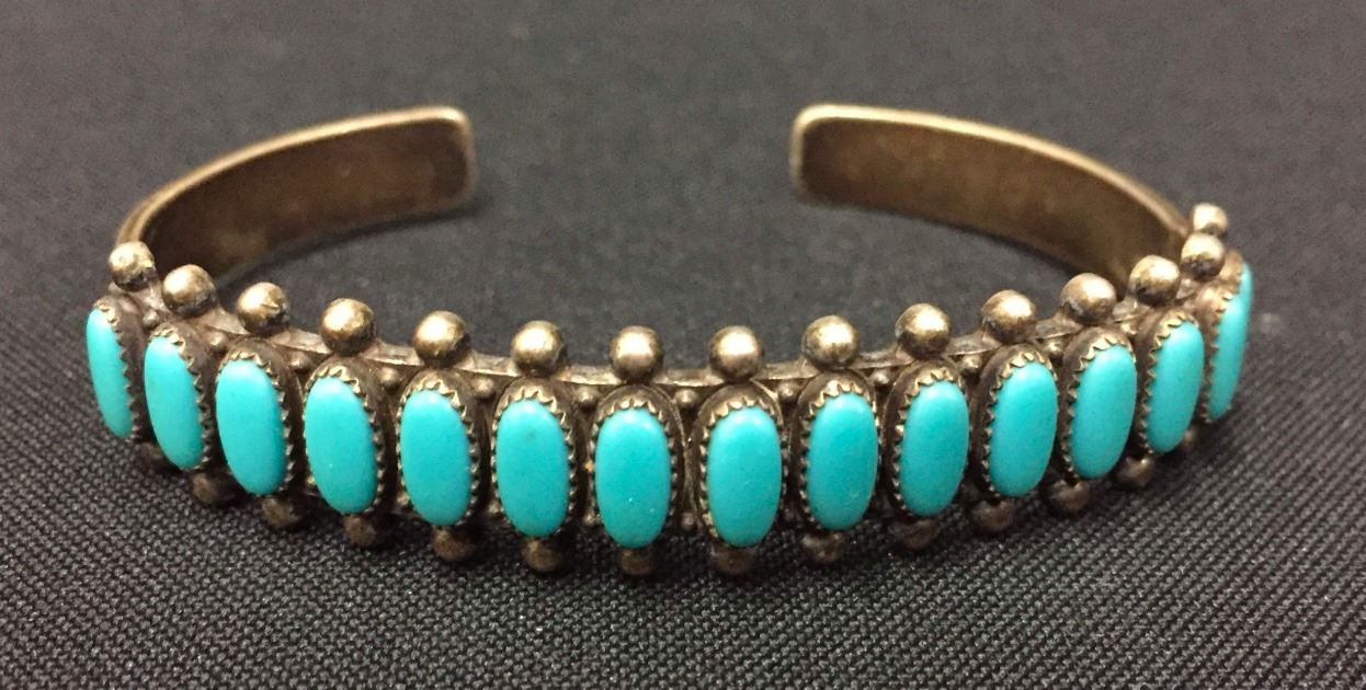 Maker: Unknown, but appears to be Navajo. Approx. Age: Circa 1940s. Size: Measures 5.25” inside plus there is just under a 1”opening. It’s .5” wide across the face and weighs 18.5g. Condition: Pretty good for its age. Additional Info: Old faux turquoise settings. Marked as sterling silver. Please look closely at the pictures - they are an important part of our description. Shipping: There will be a $5 handling / packaging fee for shipping this lot. The actual cost of postage will be added on top of that.