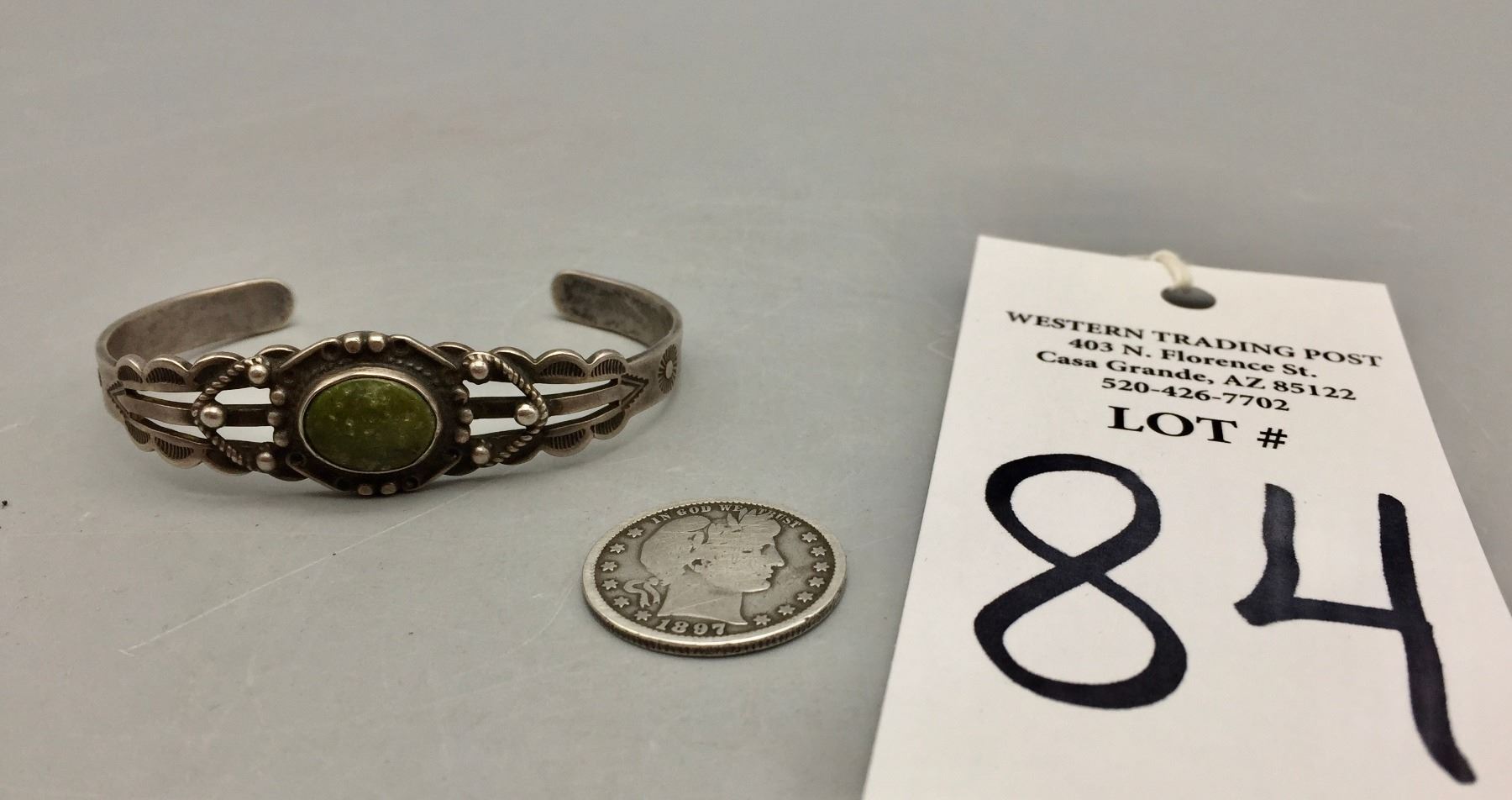Description: This great old bracelet features a nice, old green turquoise cabochon and has hand-stamp / hand-embellishments. Tested positive as Sterling (.925) or Coin (.900) silver. Maker: Most likely Navajo or Pueblo made, but there is no maker's hallmark (as was common of most Native jewelry from this era). Approx. Age: Vintage (Circa 1930s). Size: Inside circumference measures 5 1/4 inches plus there is a 1 1/4 inch gap, (making the inside circumference fit an approx. 6 1/2" wrist). It is 3/4 inch across at its widest point. Weighs 17.2 g. Condition: Vintage, good for its age, normal wear expected. Please look closely at the pictures - they are an important part of our description. Shipping: There will be a $5 handling / packaging fee for shipping this lot. The actual cost of postage will be added on top of that.