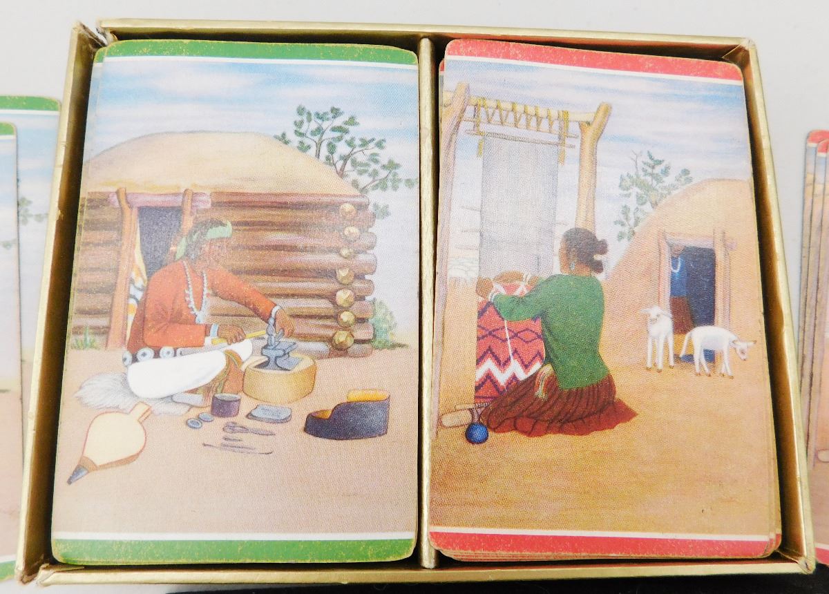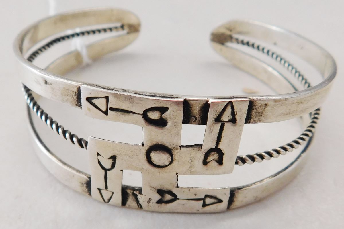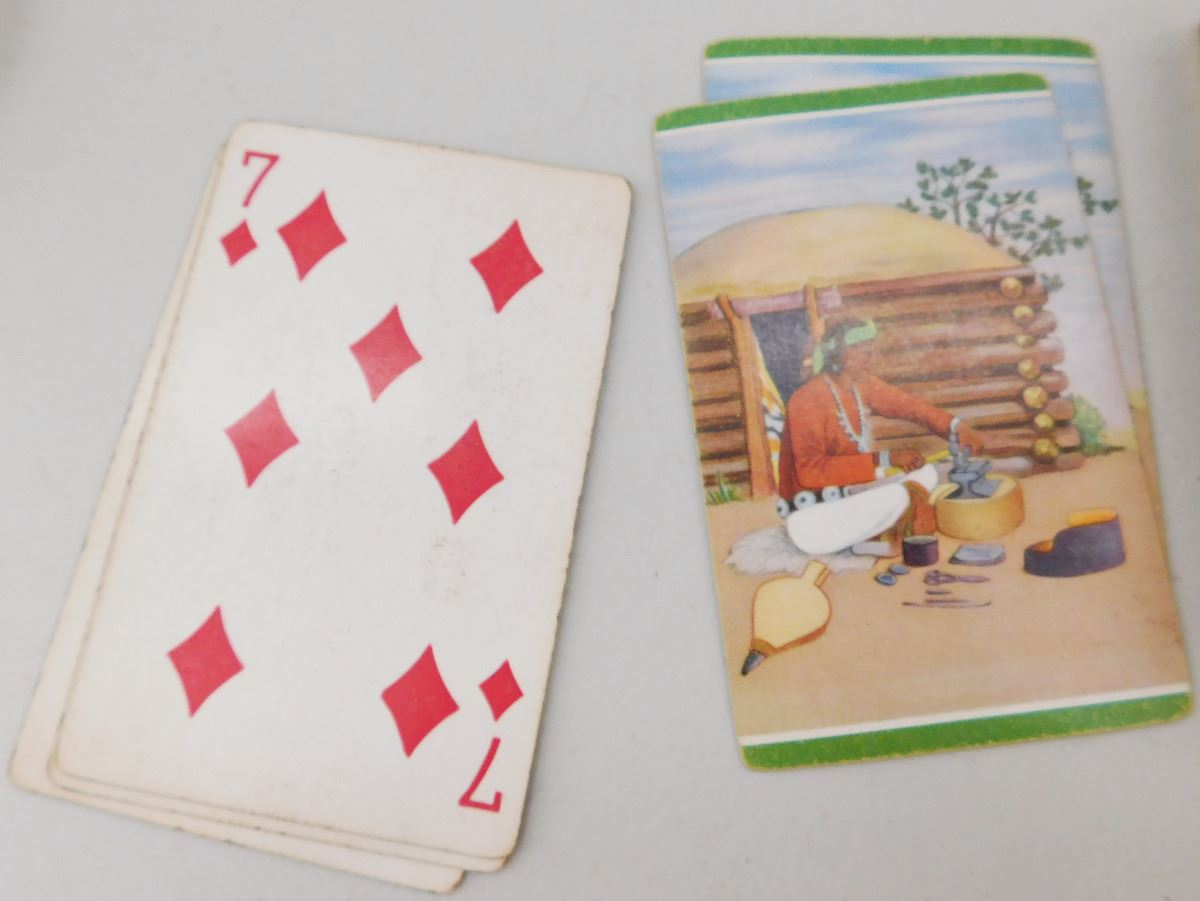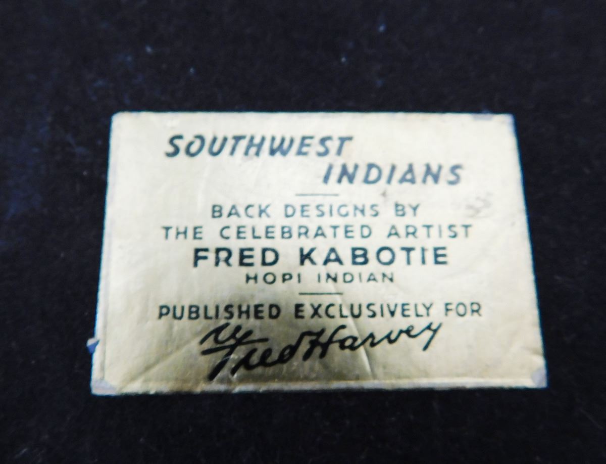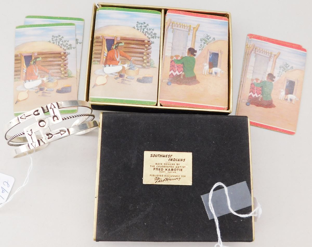 Fred Harvey Era Items, circa 1930s. The bracelet is made of sterling silver, measuring 7.5" around with a 1" gap, the playing cards are made of paper and measures 5" x 4" x 1". From Arizona. 2 sets of cards in box made for Fred Harvey. Bracelet has Fred Harvey type design. Condition: Good, see images. Shipping: $20.00.