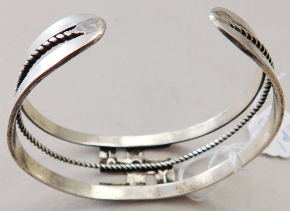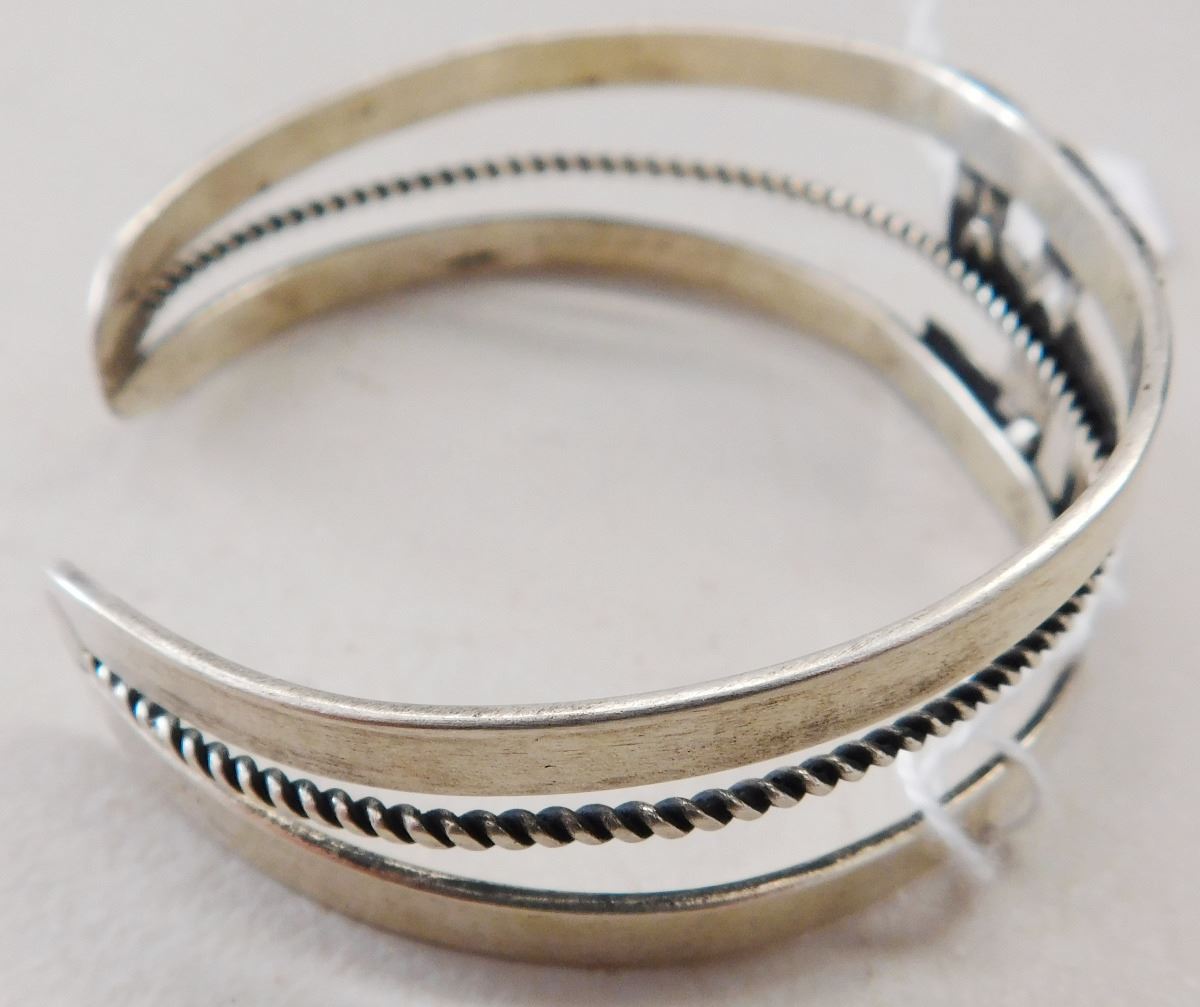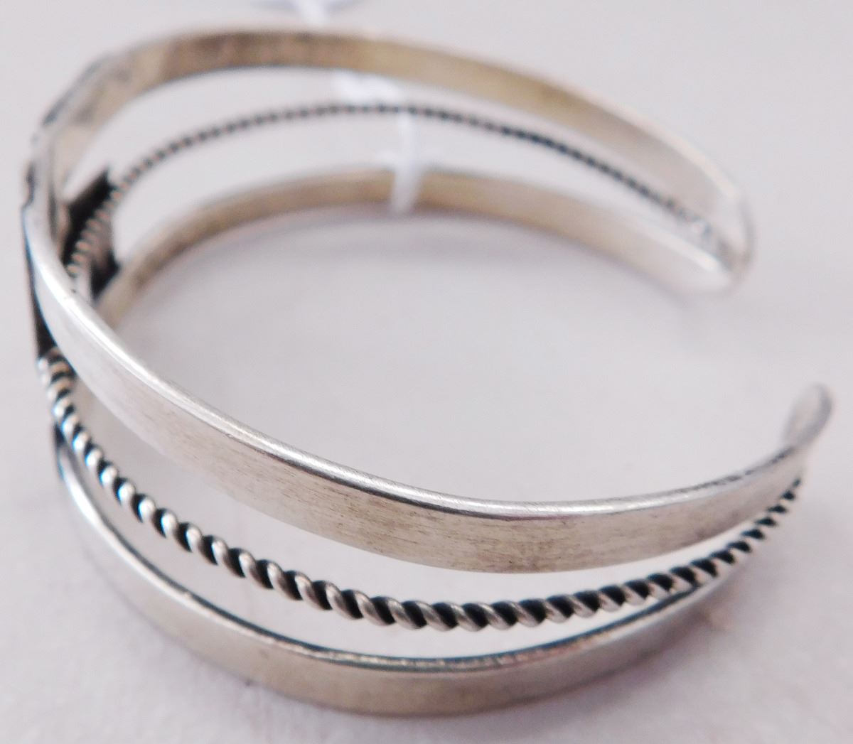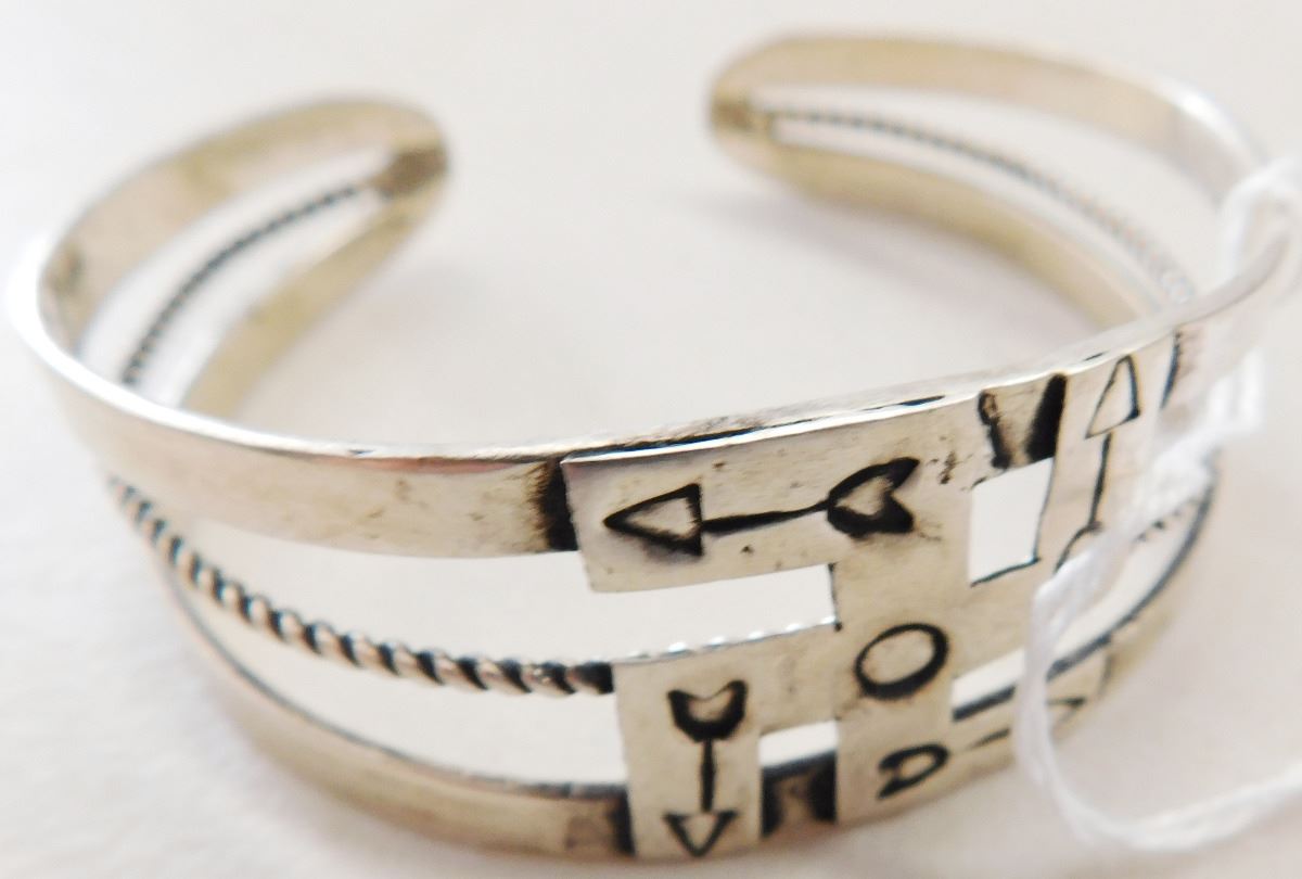 Fred Harvey Era Items, circa 1930s. The bracelet is made of sterling silver, measuring 7.5" around with a 1" gap, the playing cards are made of paper and measures 5" x 4" x 1". From Arizona. 2 sets of cards in box made for Fred Harvey. Bracelet has Fred Harvey type design. Condition: Good, see images. Shipping: $20.00.
