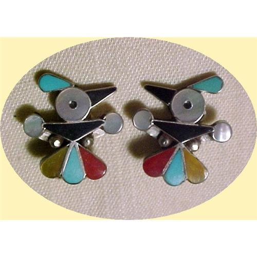 The inlay consists of turquois, mother of pearl and onyx. <p> They are unmarked but they are sterling. Much of the vintage handcrafted sterling jewelry from the Southwest was unsigned. <p> The condition is excellent.