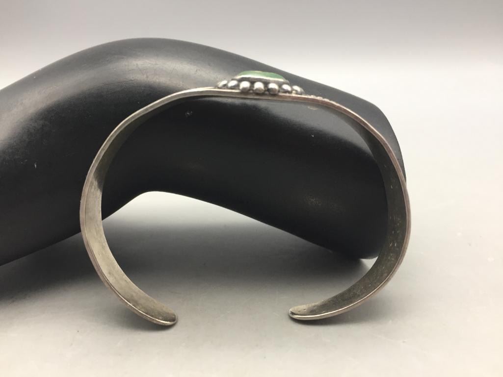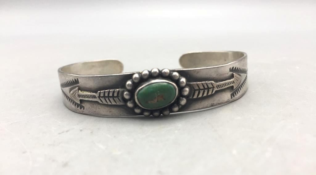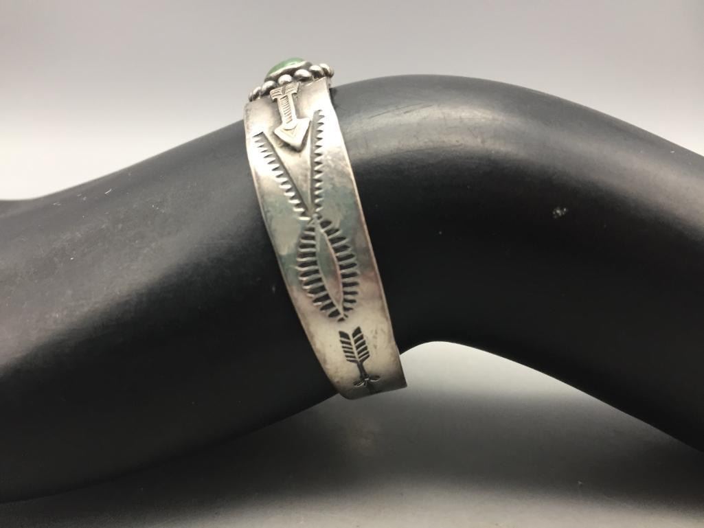 Description: Presented for sale in this lot is a Fred Harvey Era turquoise bracelet. This bracelet has the common stamp work from the era and is set with an older green turquoise stone. Maker: Unmarked. Approx. Age: Circa 1930-1950s. Size: Inside circumference measures 5-3/8 inches. Opening is an additional 7/8 inch, fitting a 6-1/4 inch wrist. Width is 1/2 inch. Weighs 15.5 grams. Condition: Good for its age, normal wear expected. Please look closely at the pictures - they are an important part of our description. Shipping: There will be a $5 handling / packaging fee for shipping this lot. The actual cost of postage will be added on top of that.
