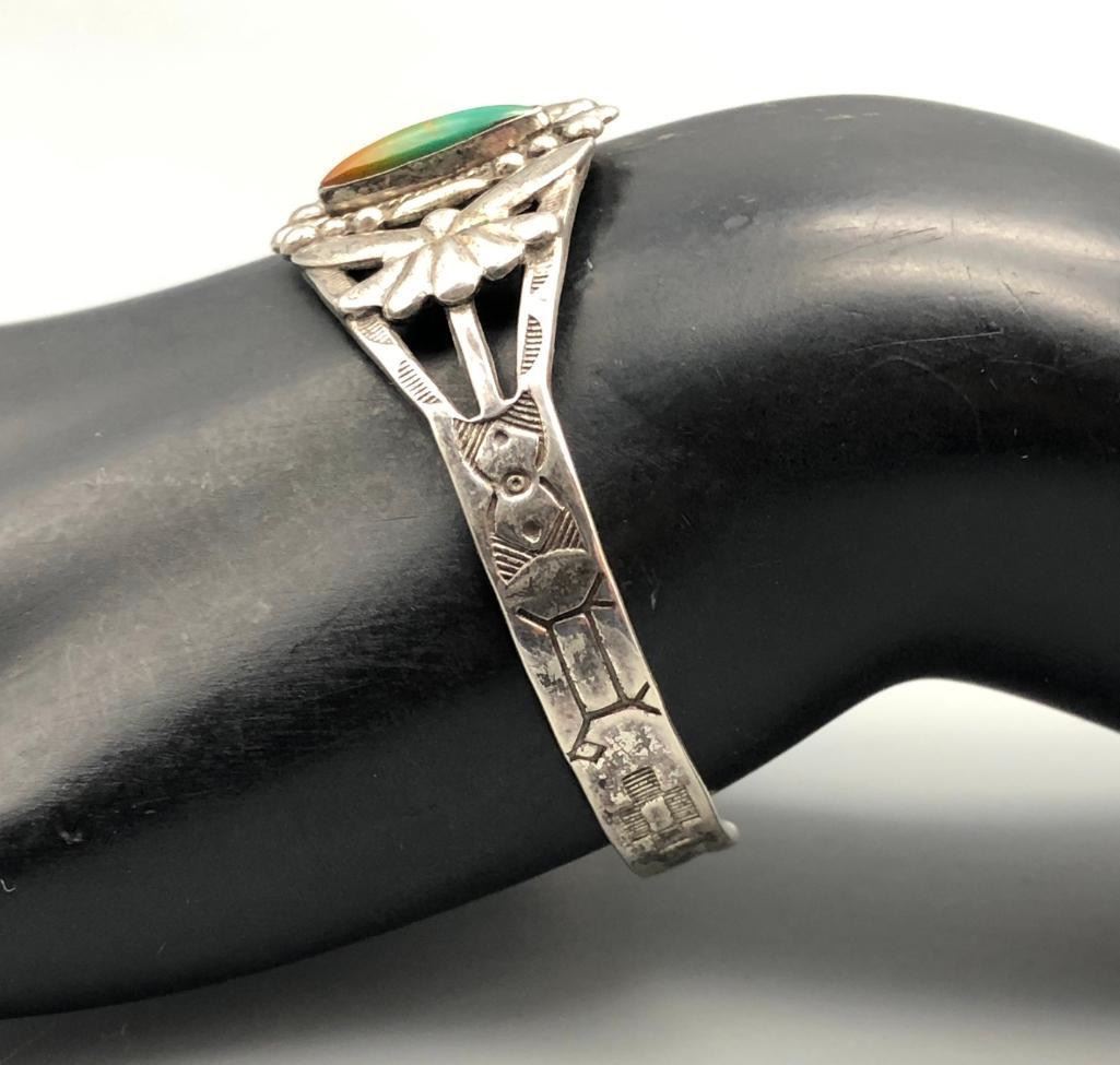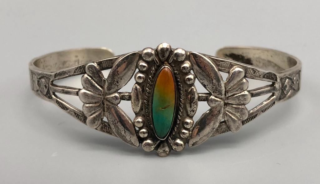 Presented for sale in this lot is a Fred Harvey Era turquoise and sterling silver bracelet. It has the signature Harvey Era hand stamped designs, applique and silverwork. Being set with a lovely two tone turquoise stone really makes it appealing. Made from sterling silver. MAKER: Unmarked. APPROX AGE: Circa 1950s. SIZE: Inside circumference measures 5-1/2 inches long. Opening is an additional 1-1/8 inch, fitting a 6-5/8 inch wrist. Width is 1 inch. Weighs 18.8 grams. CONDITION: Good for its age, normal wear expected. Please look closely at the pictures as they are an important part of our description and are hereby incorporated into the description, specifically with regards to condition. SHIPPING: There will be a $5 handling / packaging fee for shipping this lot. The actual cost of postage will be added on top of that. BUY IT NOW: If you would like to buy this item now, without waiting for the auction day to bid on it, we do offer this option (which is available up to 48 hours before the actual auction starts). The “Buy it Now” price is the high estimate of this lot (plus applicable fees and the Buyer's premium is discounted to 10% when using the Buy it Now option). If you would like to exercise this option, you must contact us by email (or phone as long as you talk to someone live). Reference this lot number and your intention to "Buy it Now."