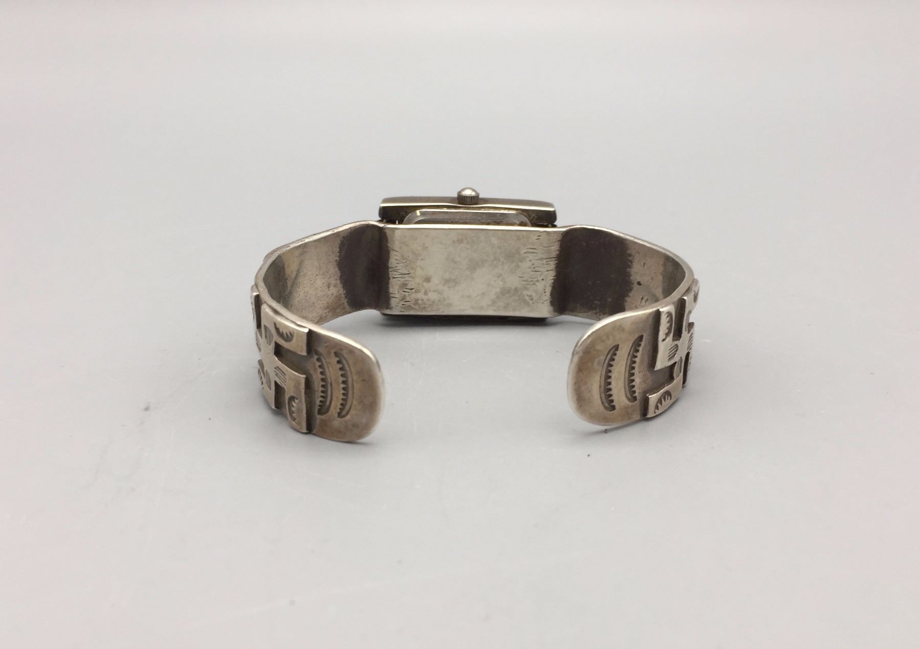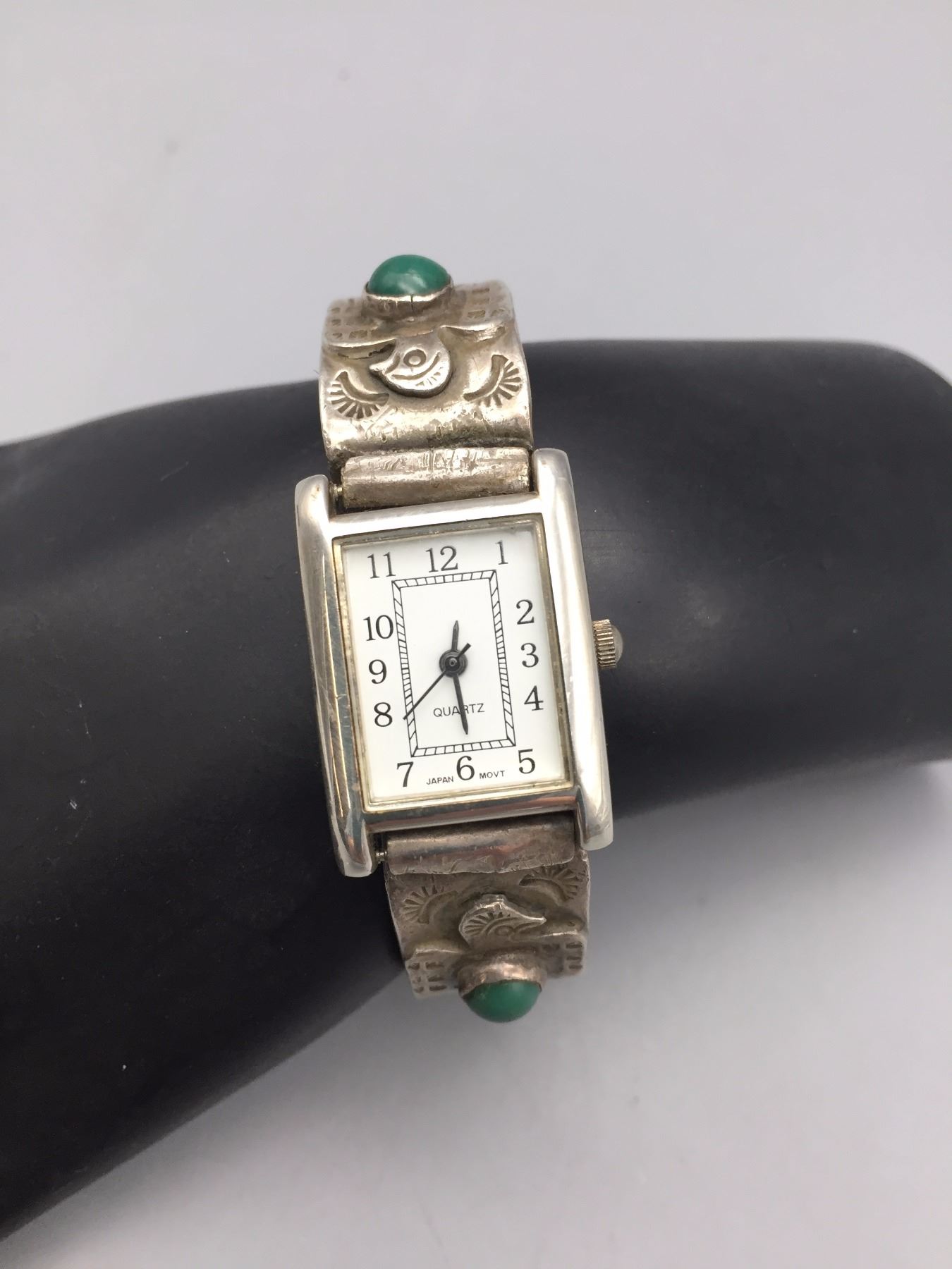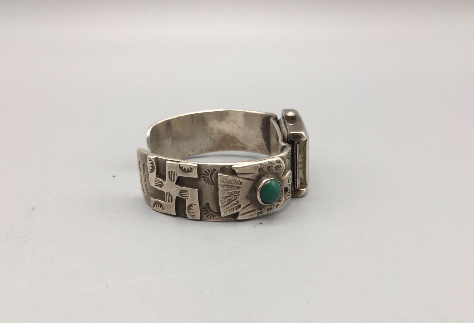 Description: An older watch bracelet with turquoise cabochons.                                                                                         Maker: Unknown.                                                                                                      Approx. Age: Vintage, circa 1930s - 40s.                                                                                                   Size: Inside circumference 5 1/4" with an additional 7/8" opening (fits a 6 1/8" wrist) 3/8" w and weighs 48.6 g.                                                                                                                                                                                                              Condition: Good for its age, normal wear expected. Please look closely at the pictures - they are an important part of our description. Shipping: There will be a $5 handling / packaging fee for shipping this lot. The actual cost of postage will be added on top of that.