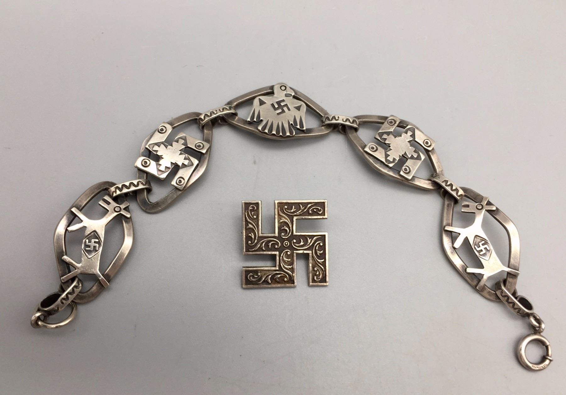 Description: Whirling log bracelet and pin, stamped as sterling silver. In a nice display. Very unique bracelet. Maker: Unknown. Approx. Age: Circa 1930s. Size: Bracelet measures 8” l x 3/4” w, pin is 7/8”. Combined weight of 25.1 g. Condition: Good for their age, normal wear expected. Please look closely at the pictures - they are an important part of our description. Shipping: There will be a $5 handling / packaging fee for shipping this lot. The actual cost of postage will be added on top of that.