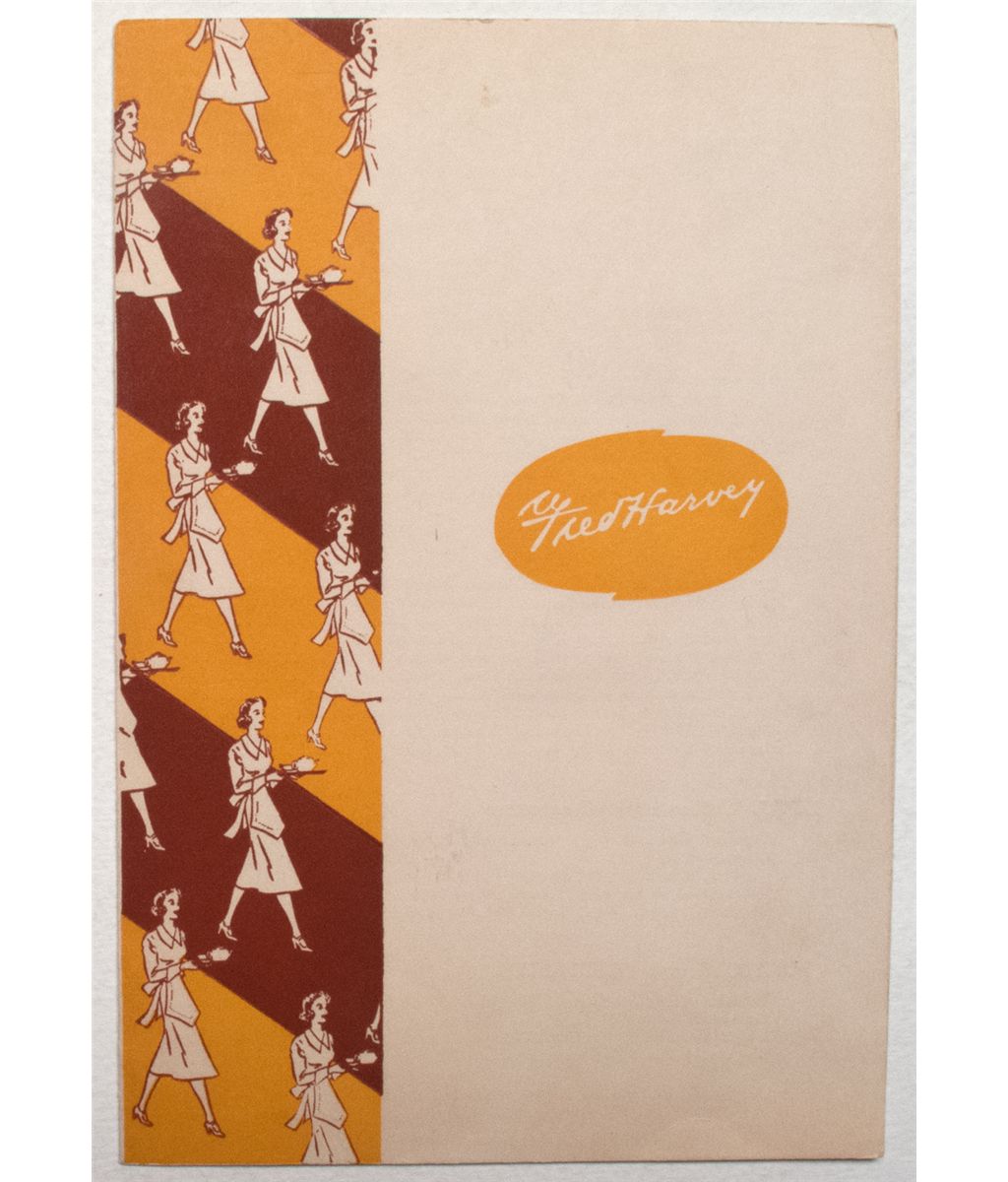 Measures 8.75” x 6” closed and 8.75” x 12” open. The menu is printed on white paper with yellow and maroon colors on the cover. There is some wear on the corners. Images of the famous Harvey girls are located on the front cover on the left side. The menuCity: County: State: NM
