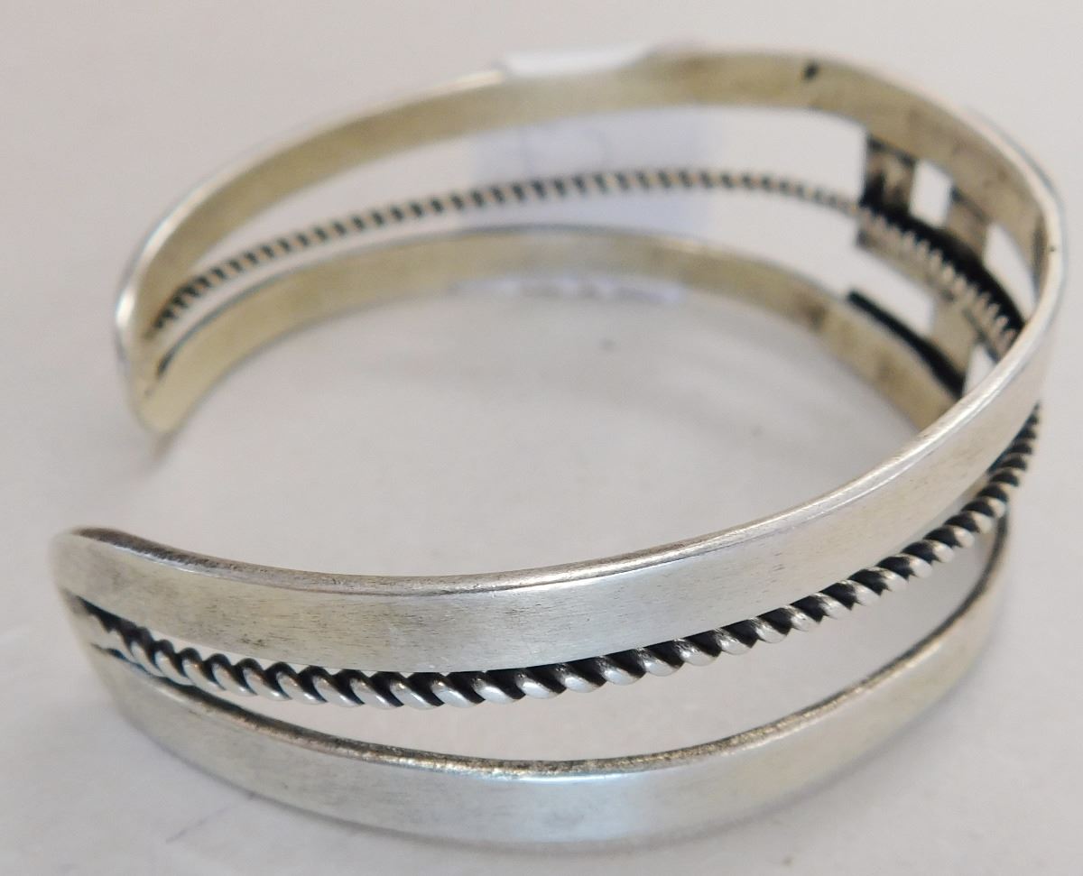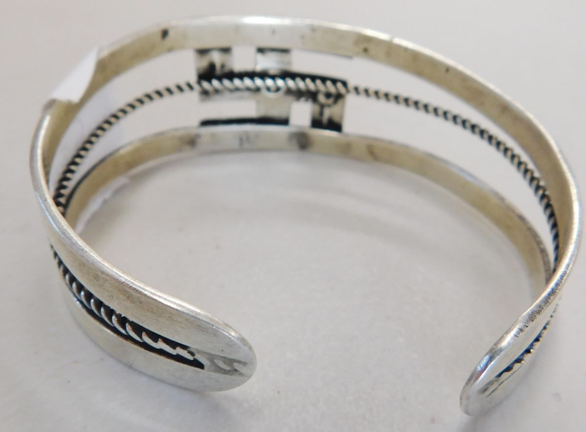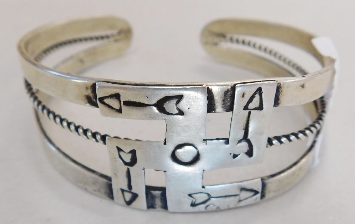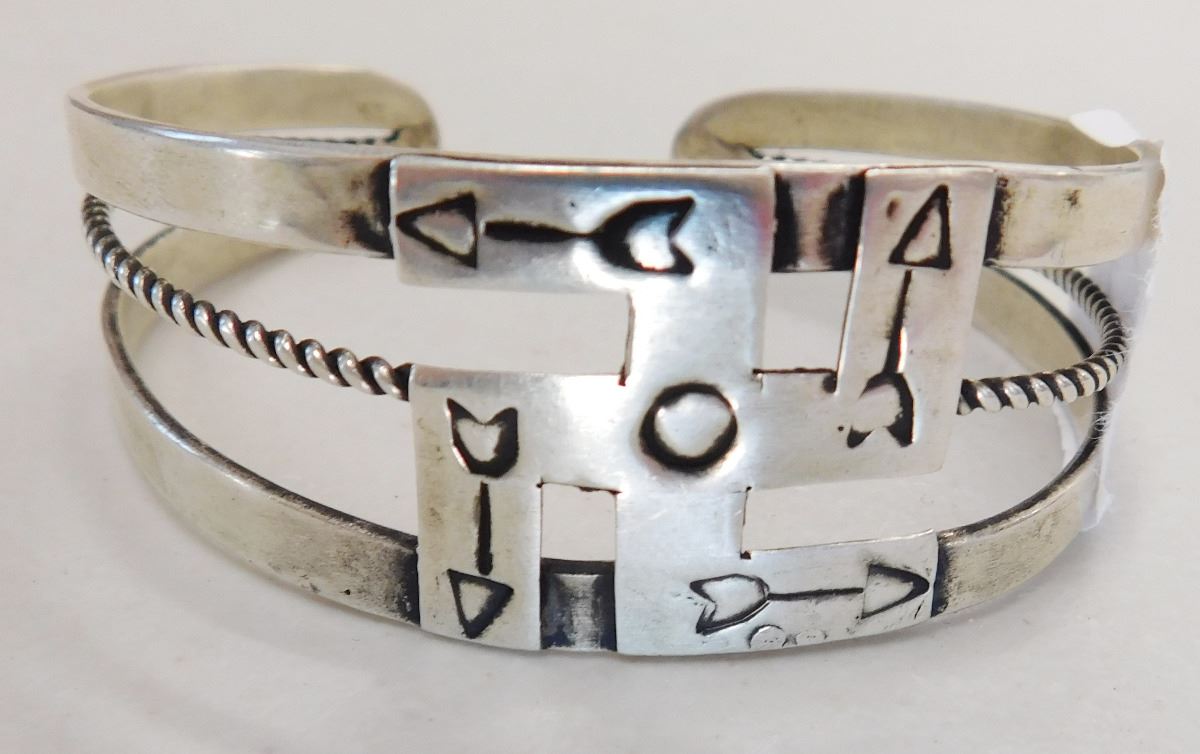 Fred Harvey Style Bracelet, circa 1940s. Made of sterling silver, this item is 7.5" around with a 0.5" gap. Arizona, Navajo. Whirling log and arrow design. Weighs approx. 23.1 grams. Condition: Good, see images. Shipping: $18.00 w/insurance.