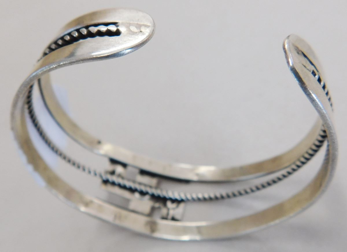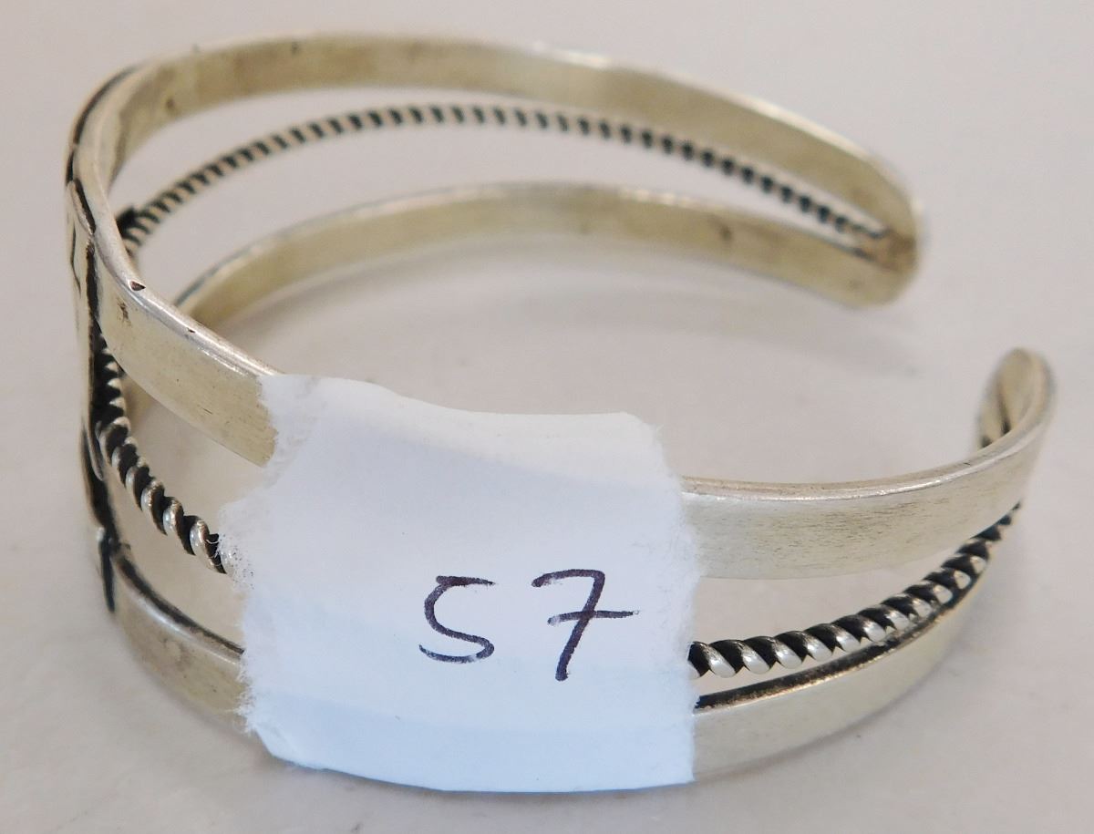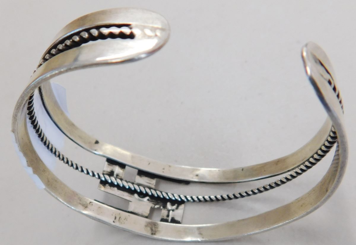 Fred Harvey Style Bracelet, circa 1940s. Made of sterling silver, this item is 7.5" around with a 0.5" gap. Arizona, Navajo. Whirling log and arrow design. Weighs approx. 23.1 grams. Condition: Good, see images. Shipping: $18.00 w/insurance.