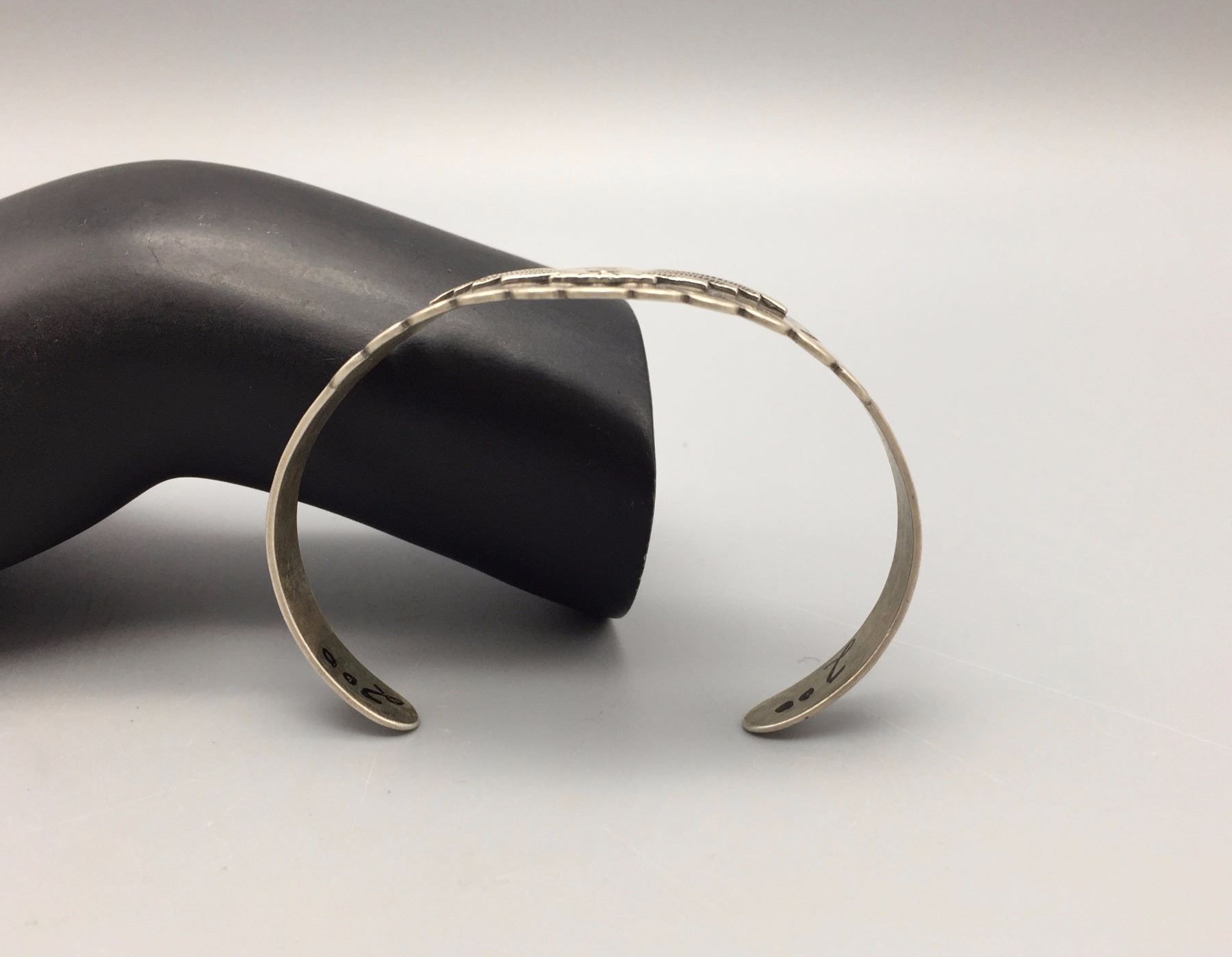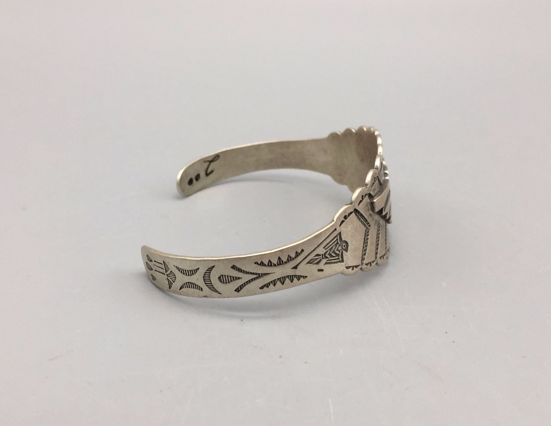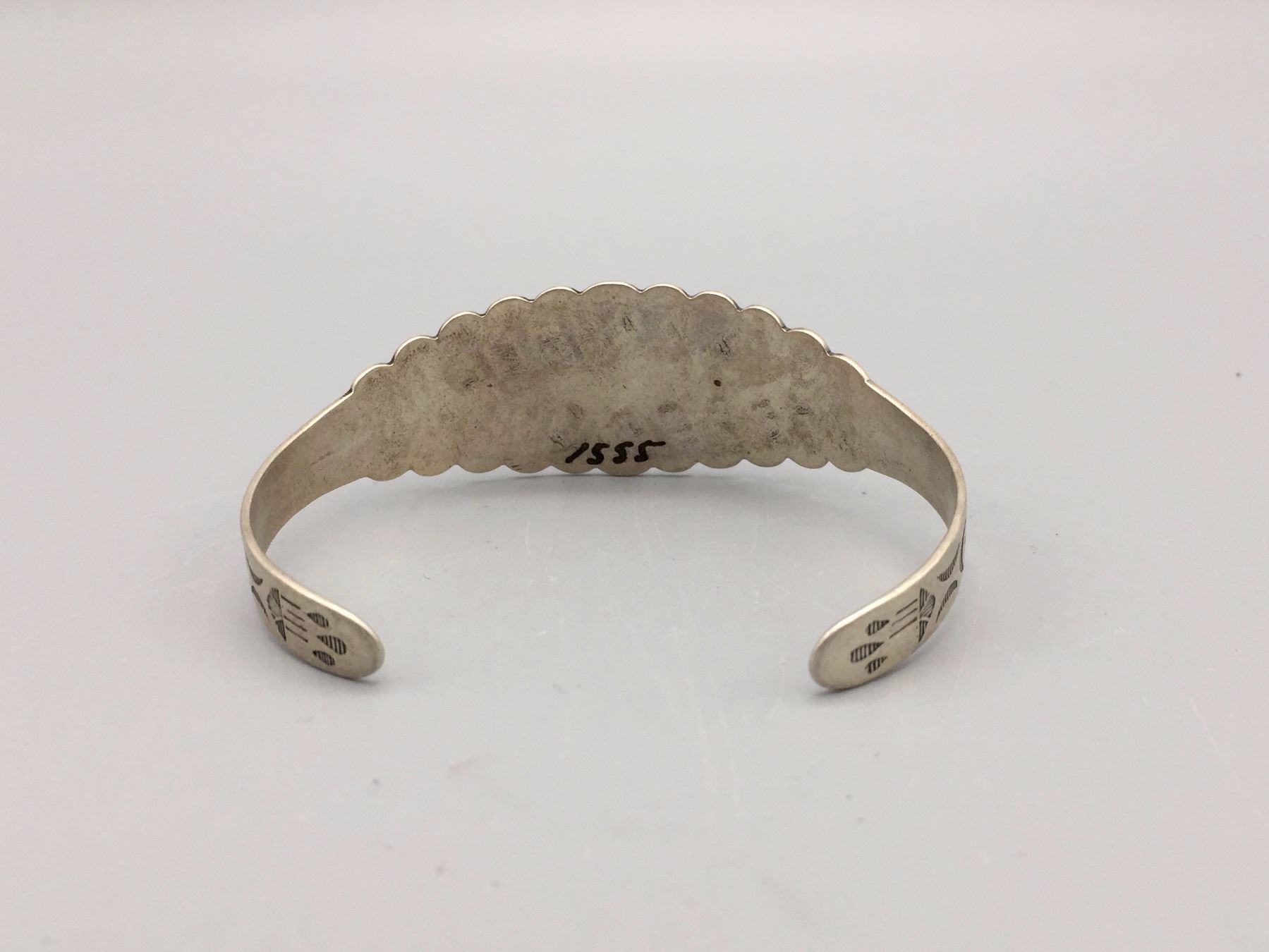 Description: Fred Harvey style sterling silver bracelet that looks like NOS (new, old stock). Came from an old store. Maker: Unmarked. Approx. Age: Vintage. Size: Inside circumference 5 1/2" with an additional 1 1/2" opening (fits a 7" wrist) 1" w and weighs 19.0 g. Condition: Good for its age, normal wear expected. Please look closely at the pictures - they are an important part of our description. Shipping: There will be a $5 handling / packaging fee for shipping this lot. The actual cost of postage will be added on top of that.