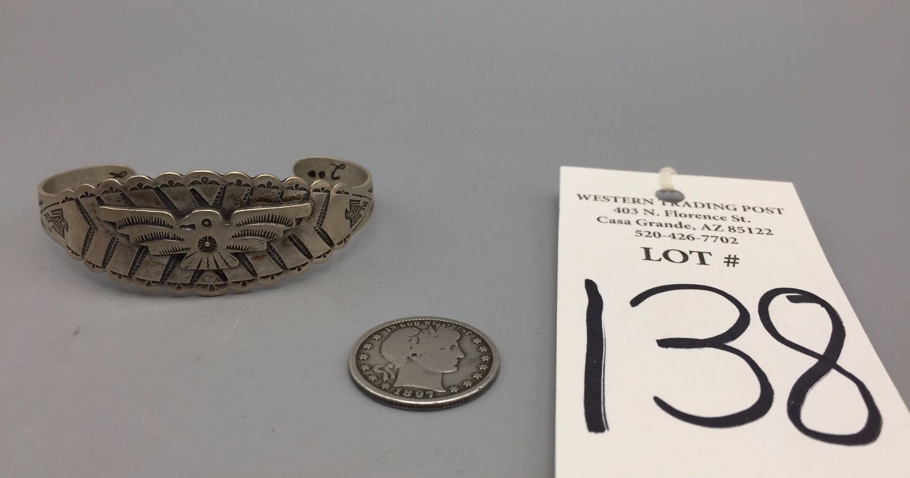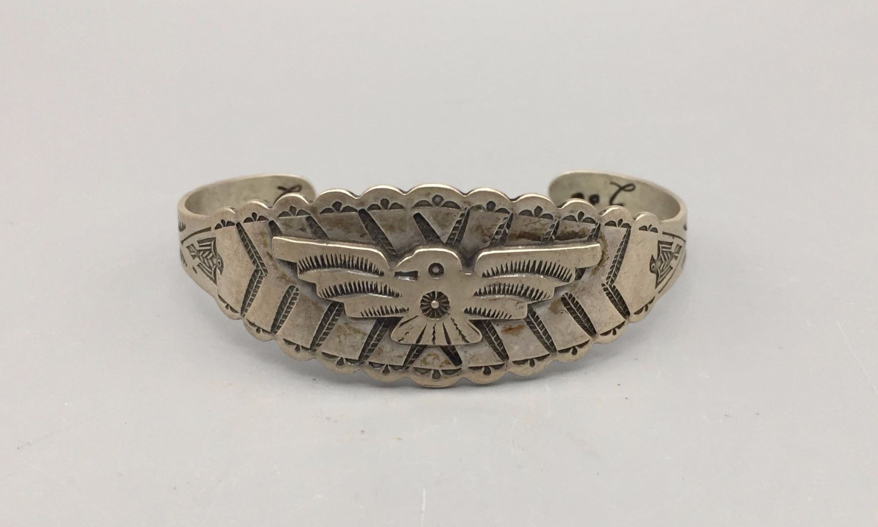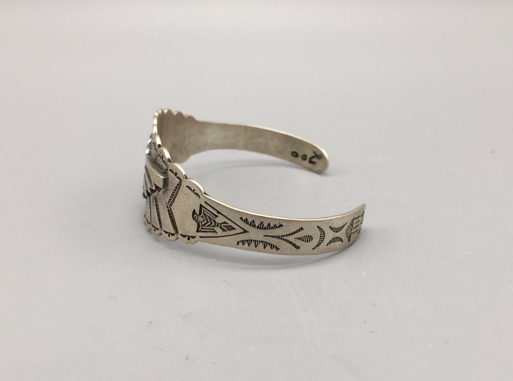 Description: Fred Harvey style sterling silver bracelet that looks like NOS (new, old stock). Came from an old store. Maker: Unmarked. Approx. Age: Vintage. Size: Inside circumference 5 1/2" with an additional 1 1/2" opening (fits a 7" wrist) 1" w and weighs 19.0 g. Condition: Good for its age, normal wear expected. Please look closely at the pictures - they are an important part of our description. Shipping: There will be a $5 handling / packaging fee for shipping this lot. The actual cost of postage will be added on top of that.