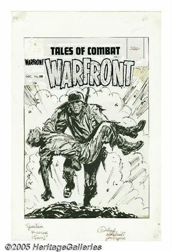 <B>Fred Kida (attributed) - Warfront #29 Cover Original Art (Harvey, 1955).</B></I> This war-torn cover features a vigorous use of the dry-brush inking technique that adds drama to the heroic image of an infantryman risking life and limb to rescue his fallen buddy during an all-out artillery attack. The energy of execution and textures displayed in these war-weary figures is expressive and direct. The image area of the art is 10.75" x 15.5". The Harvey logo and Comics Code Authority stamp stats are missing; otherwise the art is in Very Good condition