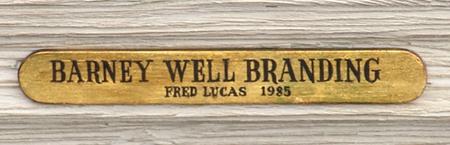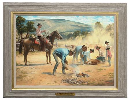 Circa 1985, Signed original oil on canvas "Barney Well Branding," a commissioned work showing actual workers at the historic Yolo Ranch near Prescott, AZ in 1985. 30" x 41" (41" x 50") From the Millican Collection.