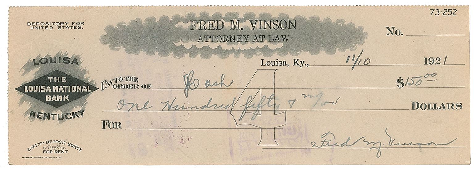 Personal check, 8.75 x 3, filled out and signed by Vinson, "Fred M. Vinson," payable to Cash for $150, November 10, 1921. In fine condition.