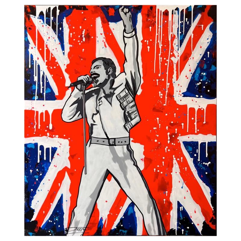 "Fred Mercury" is a unique mixed media acrylic on gallery wrapped canvas by Jozza. Hand Signed by the artist and titled in verso, the piece comes with a letter of authenticity. Measures approximately 48" x 40" (image).