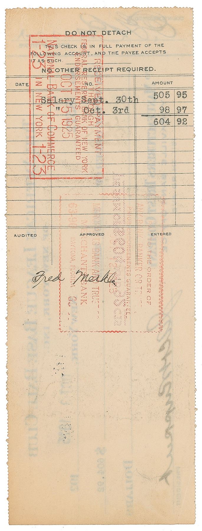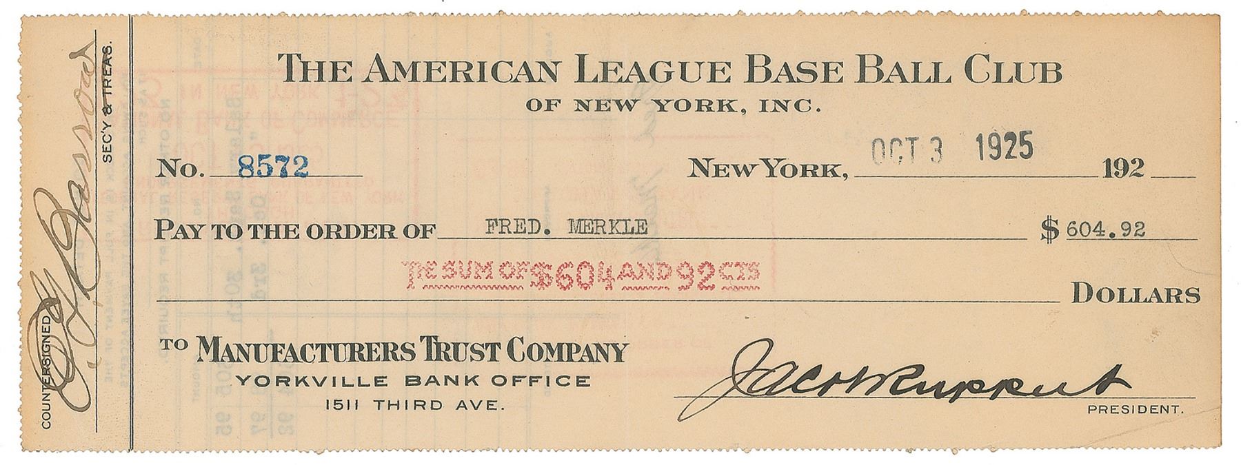 The American League Base Ball Club of New York check, 9 x 3.25, filled out in type and signed by Ruppert, "Jacob Ruppert," and vertically countersigned by Barrow, "E. G. Barrow," payable to Fred Merkle for $604.92, October 3, 1925. Endorsed on the reverse in black ink, "Fred Merkle." In fine condition. A sought-after thrice-signed check featuring the Yankees owner, general manager, and the namesake of the infamous 'Merkle's Boner.'