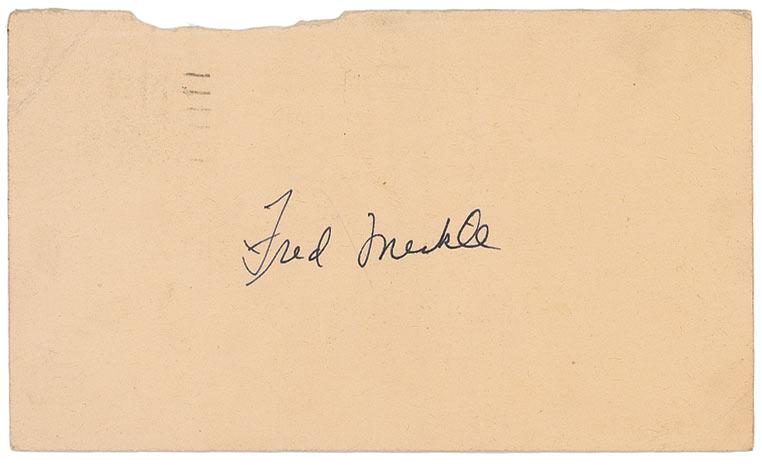 First baseman (1888-1956) best remembered for a base-running gaffe committed by rookie Fred Merkle of the New York Giants in a game against the Chicago Cubs in 1908. Merkle's failure to advance to second base on what should have been a game-winning hit led instead to a forceout at second and a tie game. Vintage fountain pen signature, “Fred Merkle,” on an off-white 5.5 x 3.25 government postcard (postmarked September 18, 1950). In very good condition, with scattered bends and a vertical crease affecting the end of his name, uniform toning, scattered soiling, missing paper at the top edge, and show-through from a postal cancellation on the reverse.