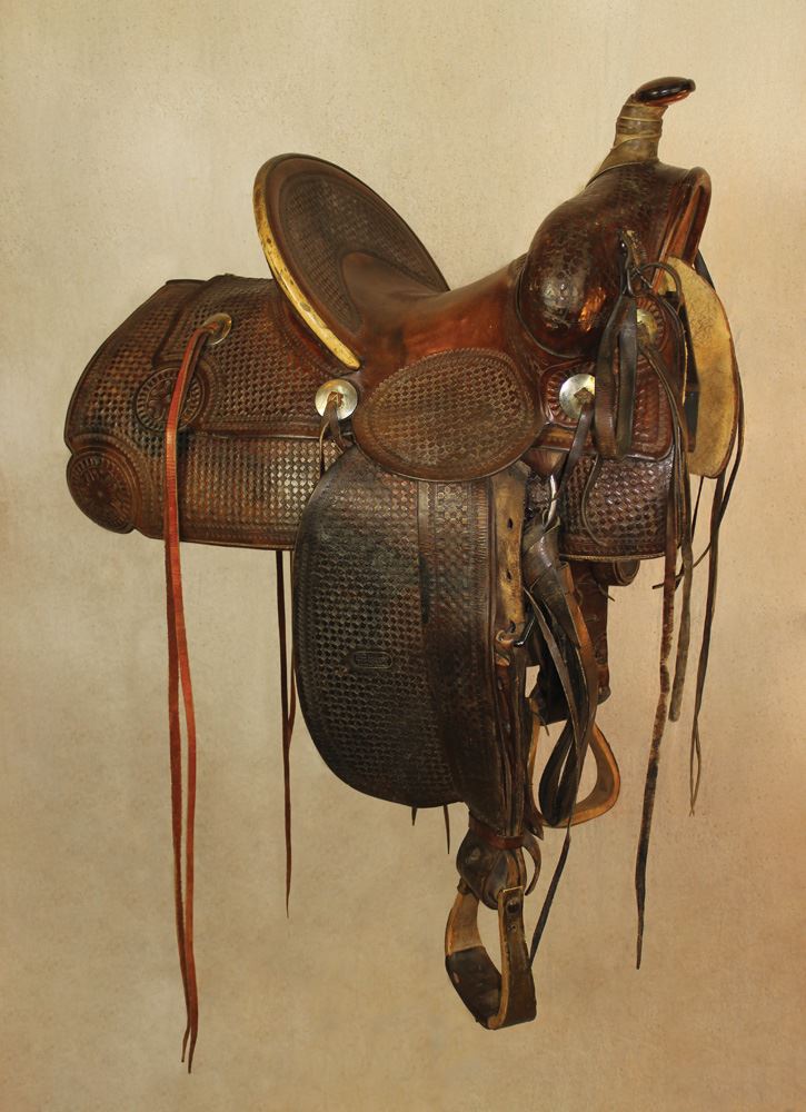 A spectacular Fred Mueller scalloped square skirt saddle with beautiful fine unusual full basketstamped design, with attractive light color and patina, brass bound stirrups and seat that measures 14" and tall 5" cantle.